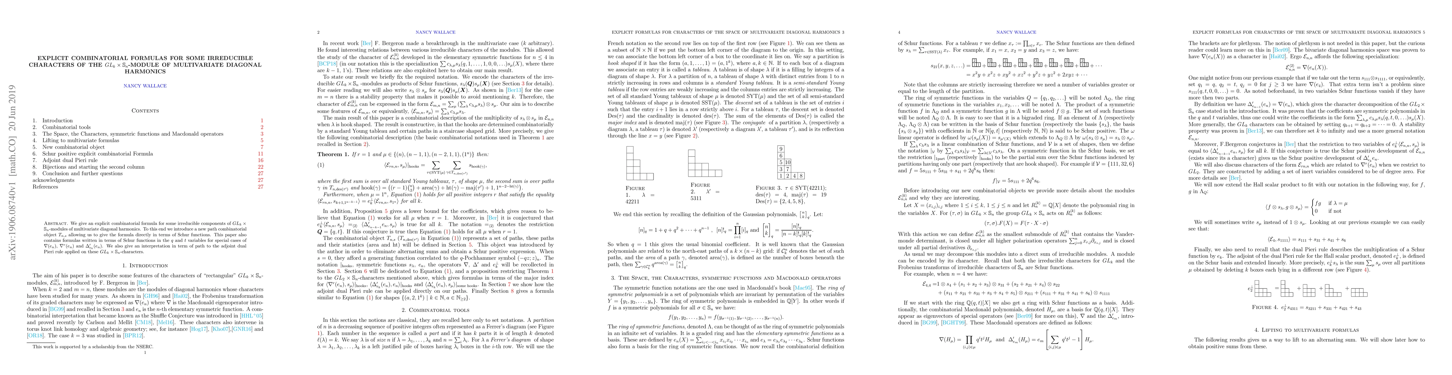 We give an explicit combinatorial formula for some irreducible components of $GL_k\times \mathbb{S}_n$-modules of multivariate diagonal harmonics. To this end we introduce a new path combinatorial object $T_{n,s}$ allowing us to give the formula directly in terms of Schur functions. This paper also contains formulas written in terms of Schur functions in the $q$ and $t$ variables for special cases of $\nabla(e_n)$, $\nabla^r(e_n)$ and $\Delta'_{e_k}(e_n)$. We also give an interpretation in term of path to the adjoint dual Pieri rule applied on these $GL_k\times \mathbb{S}_n$-characters.