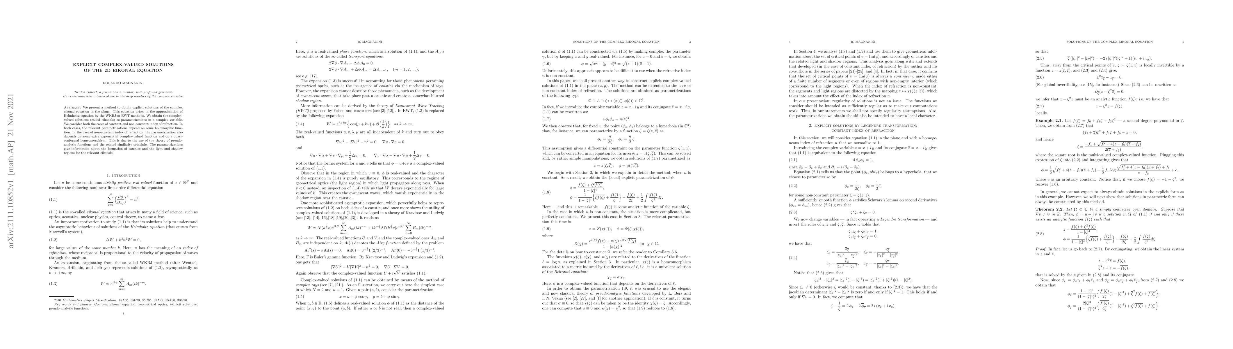 We present a method to obtain explicit solutions of the complex eikonal equation in the plane. This equation arises in the approximation of Helmholtz equation by the WKBJ or EWT methods. We obtain the complex-valued solutions (called eikonals) as parameterizations in a complex variable. We consider both the cases of constant and non-constant index of refraction. In both cases, the relevant parameterizations depend on some holomorphic function. In the case of non-constant index of refraction, the parametrization also depends on some extra exponential complex-valued function and on a quasi-conformal homeomorphism. This is due to the use of the theory of pseudo-analytic functions and the related similarity principle. The parameterizations give information about the formation of caustics and the light and shadow regions for the relevant eikonals.
