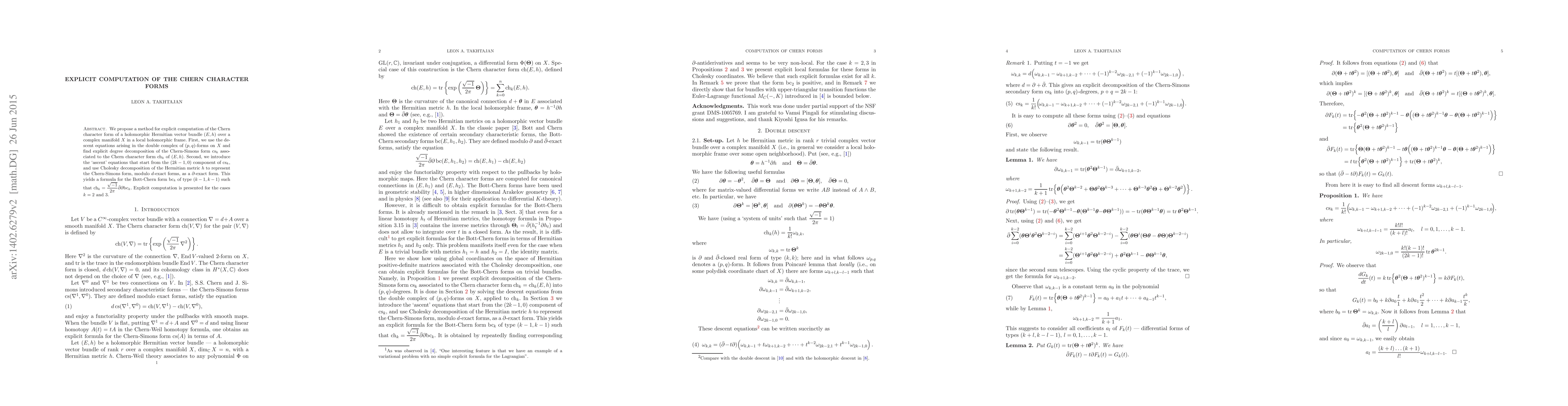This paper proposes a method for the explicit computation of the Chern character form of a holomorphic Hermitian vector bundle over a complex manifold, using descent and ascent equations to decompose the Chern-Simons form and represent it as a Bott-Chern form, with explicit computations provided for $k=2$ and $3$.