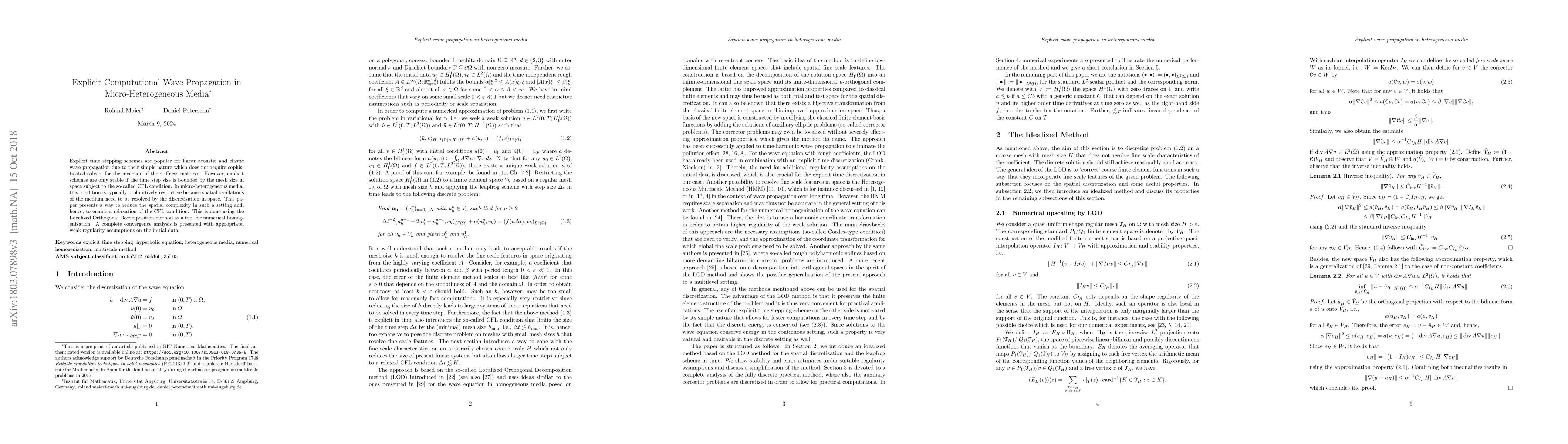 Explicit time stepping schemes are popular for linear acoustic and elastic wave propagation due to their simple nature which does not require sophisticated solvers for the inversion of the stiffness matrices. However, explicit schemes are only stable if the time step size is bounded by the mesh size in space subject to the so-called CFL condition. In micro-heterogeneous media, this condition is typically prohibitively restrictive because spatial oscillations of the medium need to be resolved by the discretization in space. This paper presents a way to reduce the spatial complexity in such a setting and, hence, to enable a relaxation of the CFL condition. This is done using the Localized Orthogonal Decomposition method as a tool for numerical homogenization. A complete convergence analysis is presented with appropriate, weak regularity assumptions on the initial data.