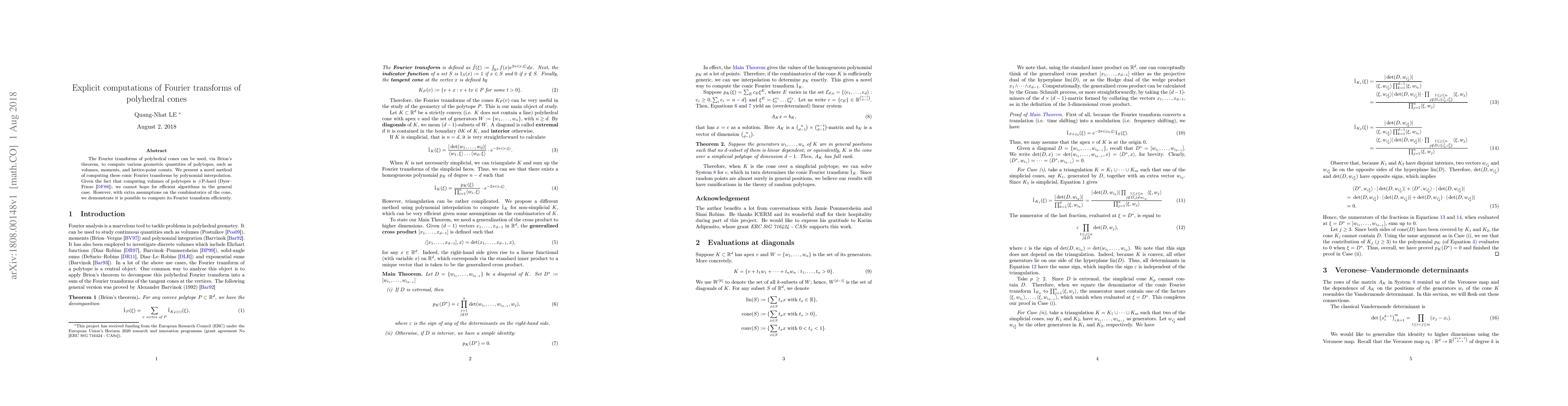 This paper introduces a new method for computing the Fourier transforms of polyhedral cones using polynomial interpolation, enabling efficient calculation of geometric quantities like volumes and moments under specific combinatorial assumptions. Despite the #P-hardness of general volume computations, the proposed method offers a feasible approach when additional combinatorics are present.