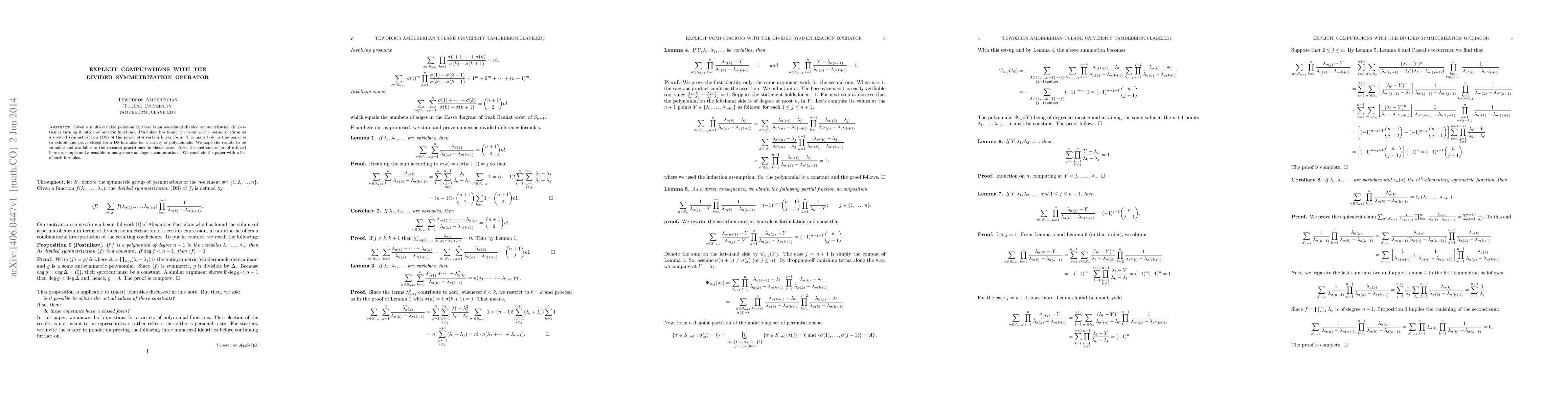Given a multi-variable polynomial, there is an associated divided symmetrization (in particular turning it into a symmetric function). Postinkov has found the volume of a permutohedron as a divided symmetrization (DS) of the power of a certain linear form. The main task in this paper is to exhibit and prove closed form DS-formulas for a variety of polynomials. We hope the results to be valuable and available to the research practitioner in these areas. Also, the methods of proof utilized here are simple and amenable to many more analogous computations. We conclude the paper with a list of such formulas.