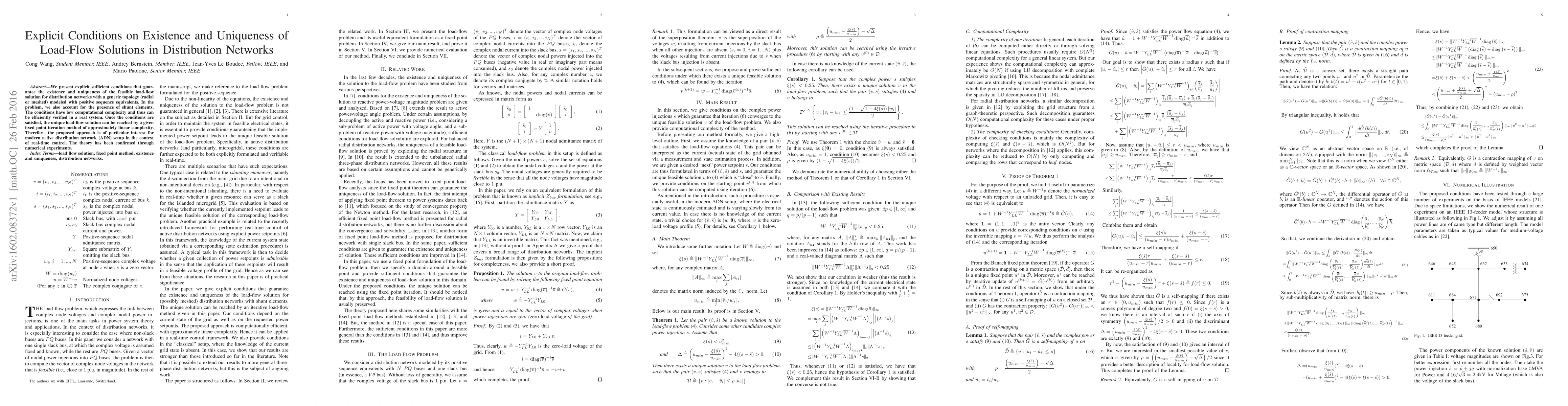 We present explicit sufficient conditions that guarantee the existence and uniqueness of the feasible load-flow solution for distribution networks with a generic topology (radial or meshed) modeled with positive sequence equivalents. In the problem, we also account for the presence of shunt elements. The conditions have low computational complexity and thus can be efficiently verified in a real system. Once the conditions are satisfied, the unique load-flow solution can be reached by a given fixed point iteration method of approximately linear complexity. Therefore, the proposed approach is of particular interest for modern active distribution network (ADN) setup in the context of real-time control. The theory has been confirmed through numerical experiments.