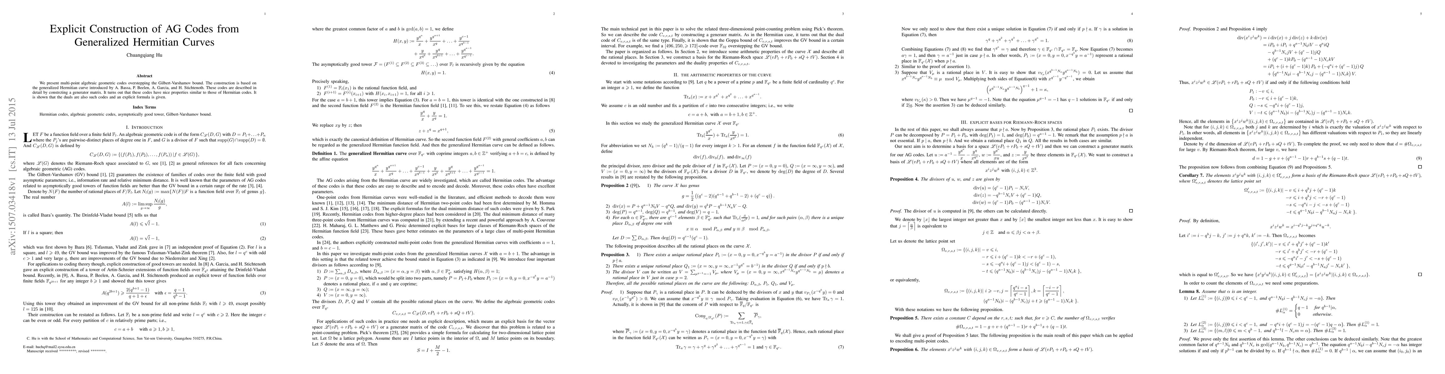 This paper constructs multi-point algebraic geometric codes surpassing the Gilbert-Varshamov bound using generalized Hermitian curves. The codes exhibit properties akin to Hermitian codes, with explicit duals and a detailed generator matrix.