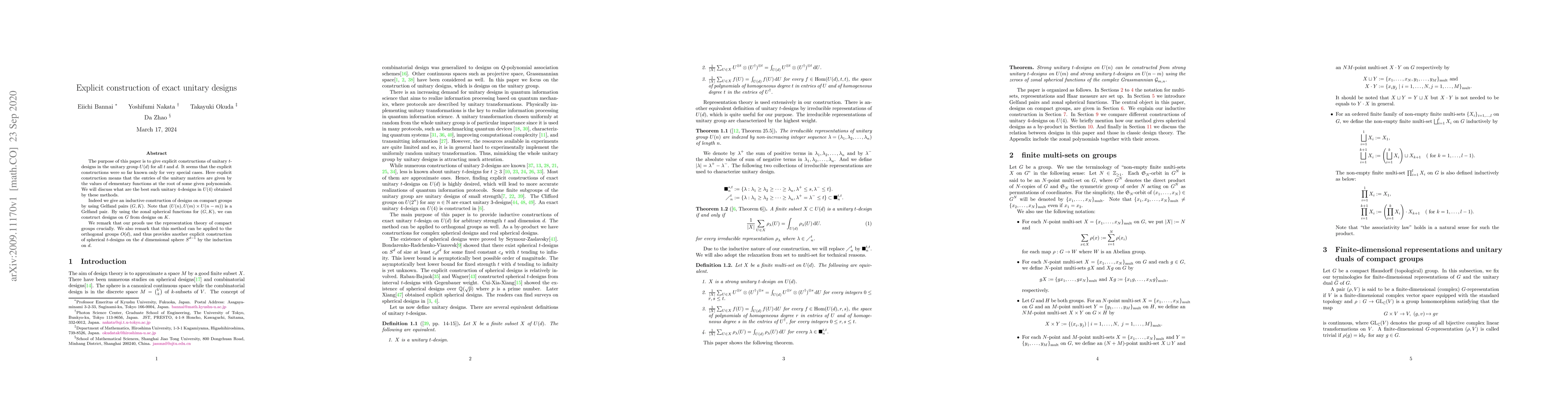 The purpose of this paper is to give explicit constructions of unitary $t$-designs in the unitary group $U(d)$ for all $t$ and $d$. It seems that the explicit constructions were so far known only for very special cases. Here explicit construction means that the entries of the unitary matrices are given by the values of elementary functions at the root of some given polynomials. We will discuss what are the best such unitary $4$-designs in $U(4)$ obtained by these methods. Indeed we give an inductive construction of designs on compact groups by using Gelfand pairs $(G,K)$. Note that $(U(n),U(m) \times U(n-m))$ is a Gelfand pair. By using the zonal spherical functions for $(G,K)$, we can construct designs on $G$ from designs on $K$. We remark that our proofs use the representation theory of compact groups crucially. We also remark that this method can be applied to the orthogonal groups $O(d)$, and thus provides another explicit construction of spherical $t$-designs on the $d$ dimensional sphere $S^{d-1}$ by the induction on $d$.