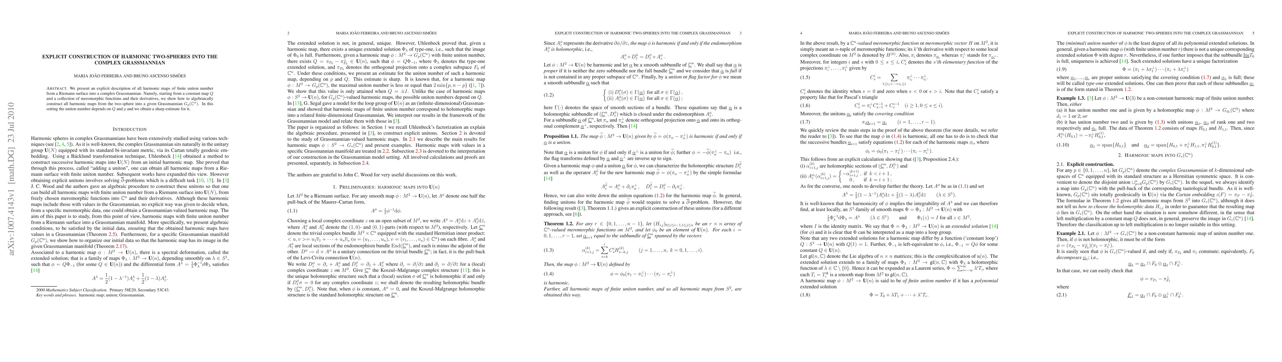 We present an explicit description of all harmonic maps of finite uniton number from a Riemann surface into a complex Grassmannian. Namely, starting from a constant map $Q$ and a collection of meromorphic functions and their derivatives, we show how to algebraically construct all harmonic maps from the two-sphere into a given Grassmannian $G_p(\mathbb C^n)$. In this setting the uniton number depends on $Q$ and $p$ and we obtain a sharp estimate for it.