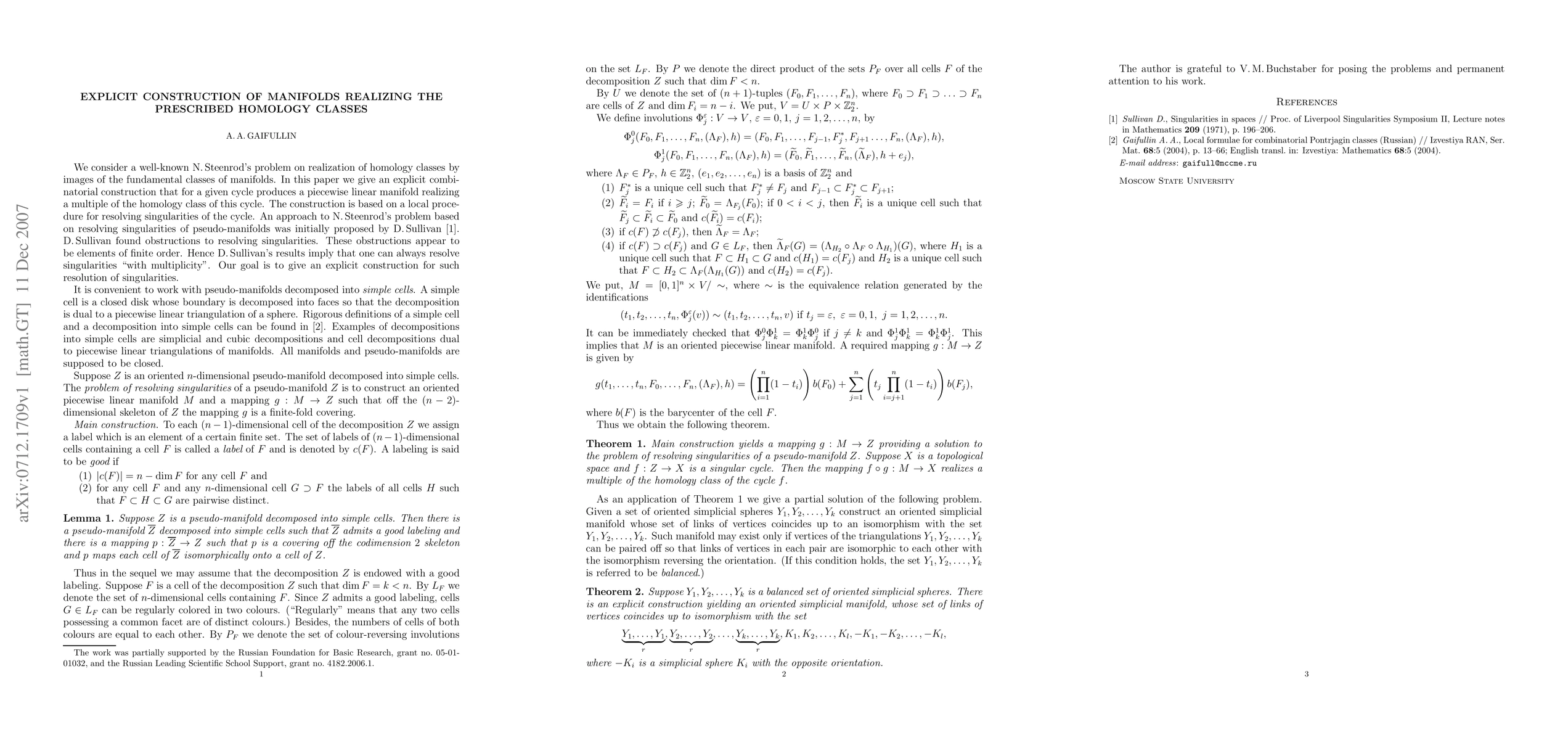 This paper presents an explicit construction for combinatorial manifolds that realize prescribed integral homology classes, addressing a classical problem by N. Steenrod. The method involves a combinatorial procedure to resolve singularities of pseudo-manifolds, with an application to constructing manifolds with specific vertex link sets.