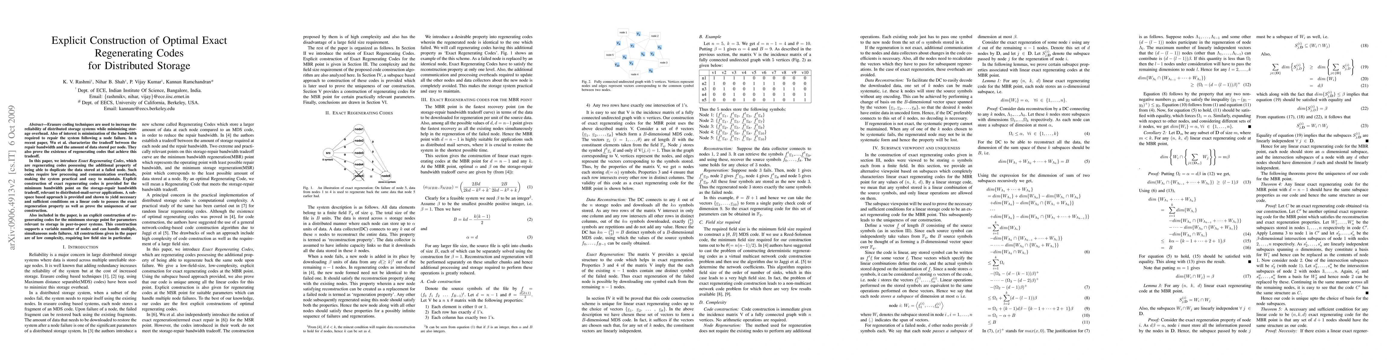 This paper introduces Exact Regenerating Codes, which enable data duplication in distributed storage systems with minimal overhead. The authors provide explicit constructions for optimal codes that minimize bandwidth and storage, supporting practical applications in distributed-mail-servers and peer-to-peer systems, with a focus on low complexity and field size.