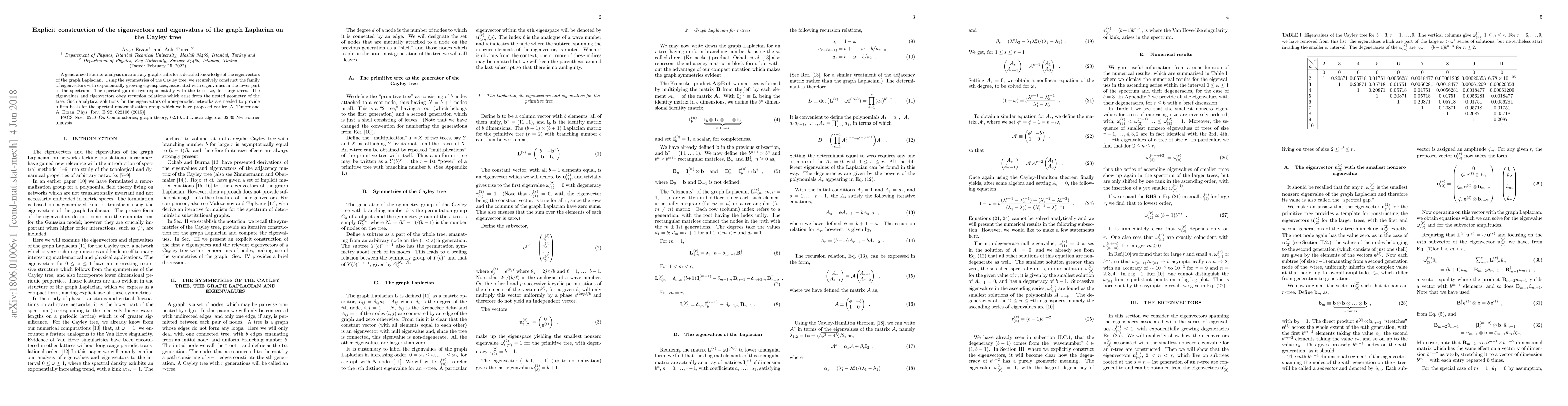 A generalized Fourier analysis on arbitrary graphs calls for a detailed knowledge of the eigenvectors of the graph Laplacian. Using the symmetries of the Cayley tree, we recursively construct the family of eigenvectors with exponentially growing eigenspaces, associated with eigenvalues in the lower part of the spectrum. The spectral gap decays exponentially with the tree size, for large trees. The eigenvalues and eigenvectors obey recursion relations which arise from the nested geometry of the tree. Such analytical solutions for the eigenvectors of non-periodic networks are needed to provide a firm basis for the spectral renormalization group which we have proposed earlier [A. Tuncer and A. Erzan, Phys. Rev. E {\bf 92}, 022106 (2015)]. PACS Nos. 02.10.Ox Combinatorics; graph theory, 02.10.Ud Linear algebra, 02.30 Nw Fourier analysis