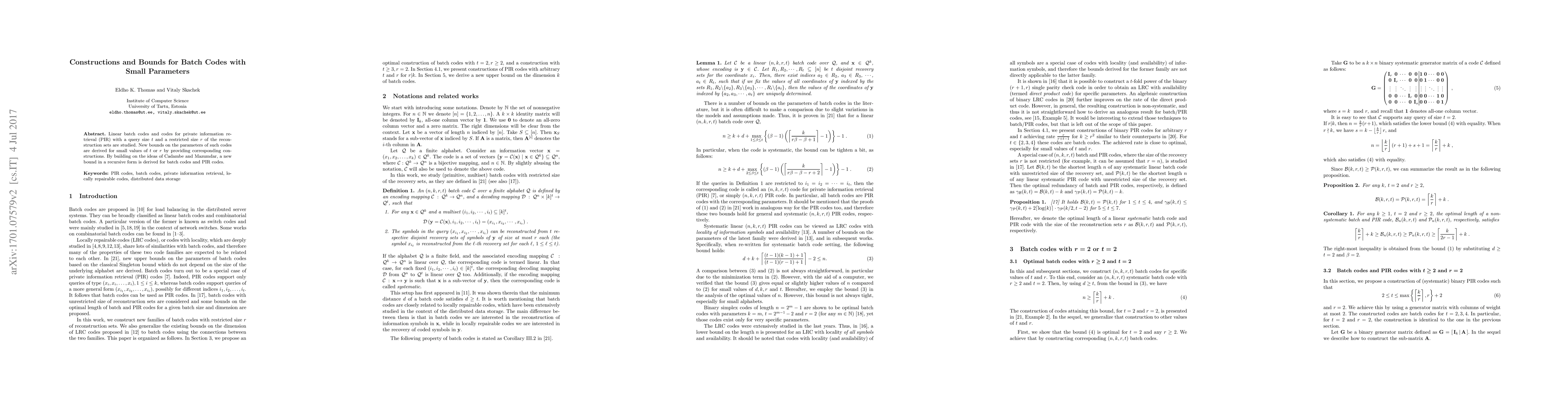 This paper presents new constructions and bounds for linear batch codes and private information retrieval (PIR) codes with query size $t$ and restricted reconstruction set size $r$. It introduces a recursive bound based on the ideas of Cadambe and Mazumdar, particularly effective for small values of $t$ or $r$.