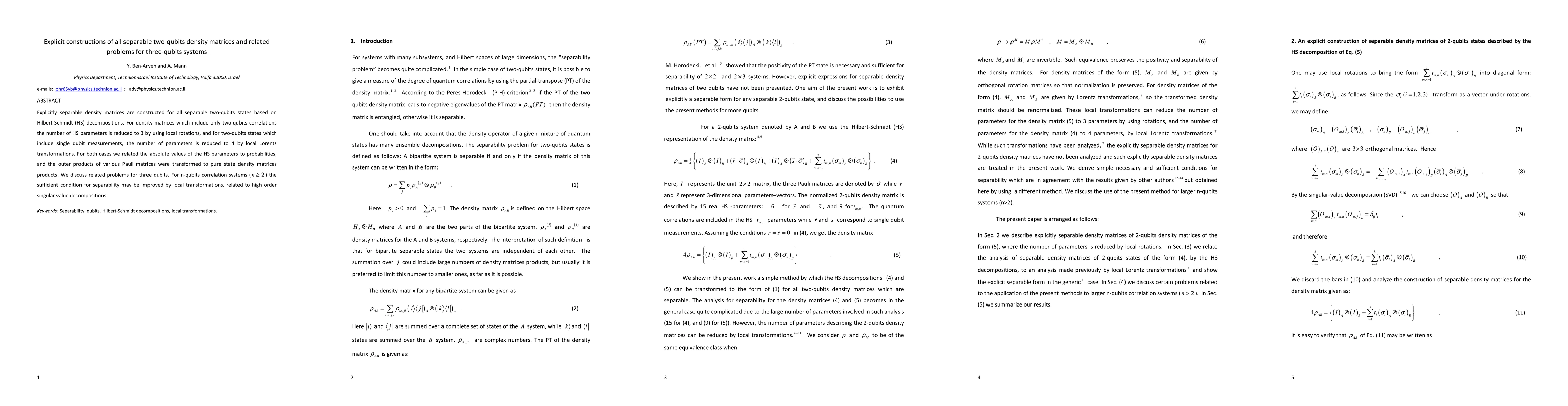 This paper constructs explicit separable density matrices for two-qubit states using Hilbert-Schmidt decompositions, reducing parameters through local rotations and Lorentz transformations. It also derives necessary and sufficient conditions for separability and discusses related problems for three-qubit systems.