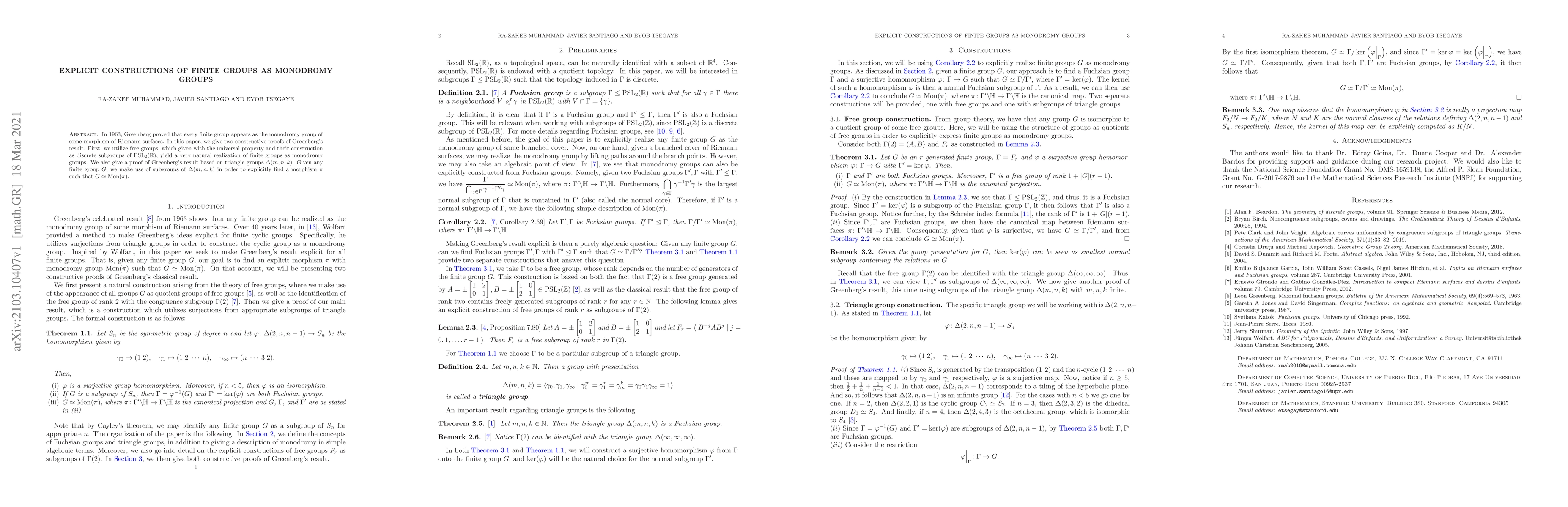 In 1963, Greenberg proved that every finite group appears as the monodromy group of some morphism of Riemann surfaces. In this paper, we give two constructive proofs of Greenberg's result. First, we utilize free groups, which given with the universal property and their construction as discrete subgroups of $\operatorname{PSL}_2(\mathbb{R})$, yield a very natural realization of finite groups as monodromy groups. We also give a proof of Greenberg's result based on triangle groups $\Delta(m, n, k)$. Given any finite group $G$, we make use of subgroups of $\Delta(m, n, k)$ in order to explicitly find a morphism $\pi$ such that $G \simeq \operatorname{Mon}(\pi)$.
