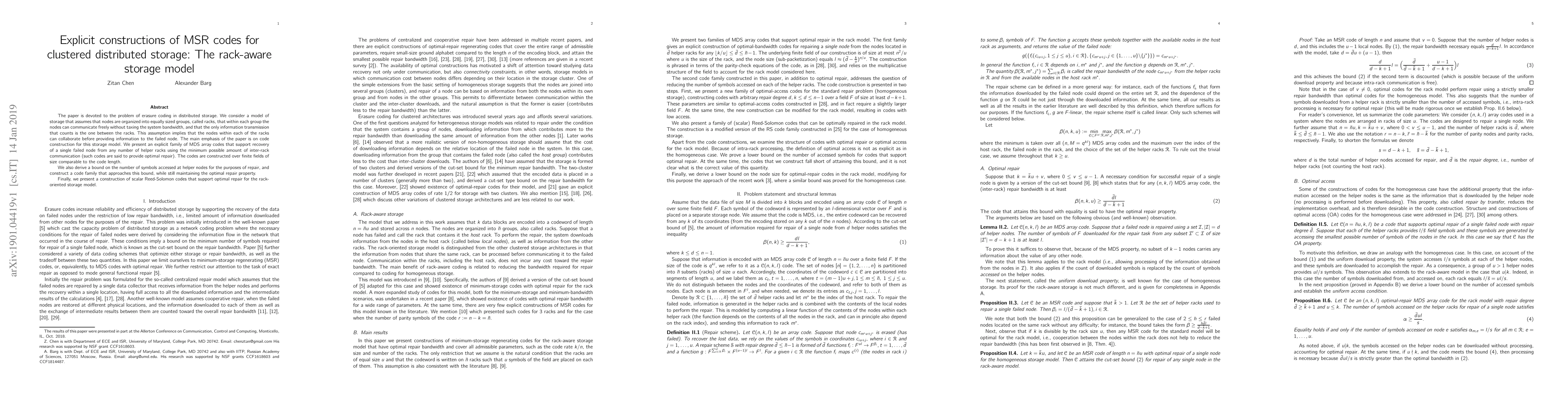 This paper constructs explicit Maximum Distance Separable (MSR) codes for a rack-aware distributed storage model, focusing on minimizing inter-rack communication for optimal repair of failed nodes. It presents an array code family and scalar Reed-Solomon codes that achieve near-optimal symbol access during repair.