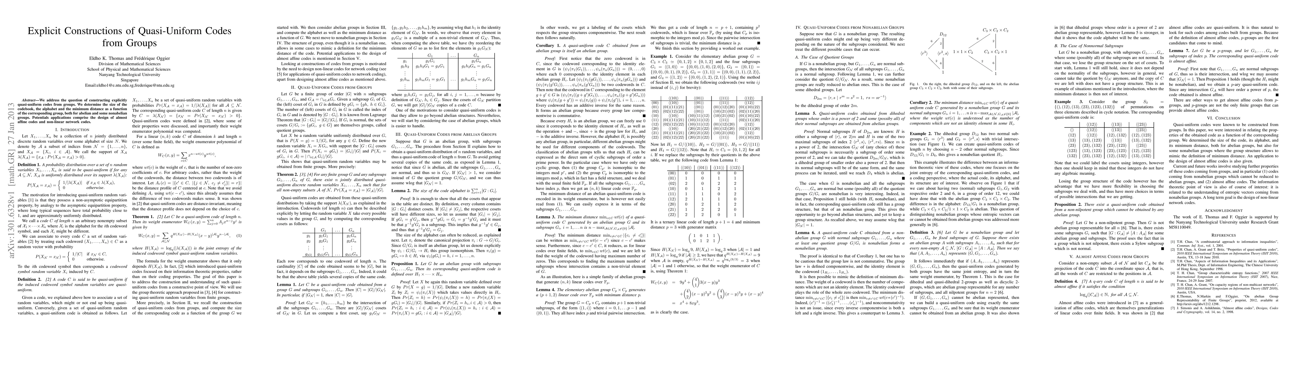 We address the question of constructing explicitly quasi-uniform codes from groups. We determine the size of the codebook, the alphabet and the minimum distance as a function of the corresponding group, both for abelian and some nonabelian groups. Potentials applications comprise the design of almost affine codes and non-linear network codes.