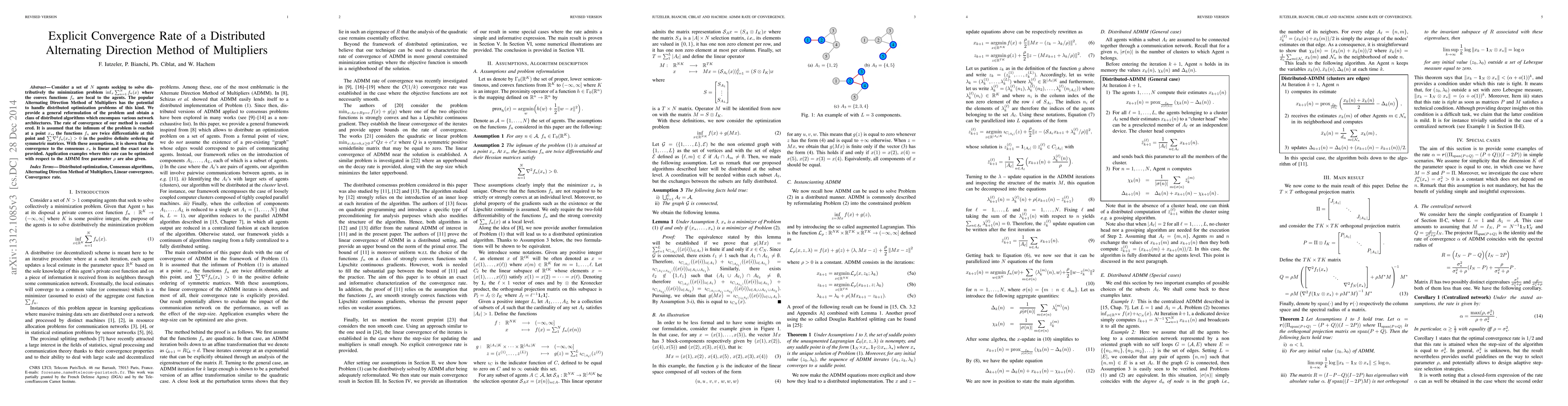 Consider a set of N agents seeking to solve distributively the minimization problem $\inf_{x} \sum_{n = 1}^N f_n(x)$ where the convex functions $f_n$ are local to the agents. The popular Alternating Direction Method of Multipliers has the potential to handle distributed optimization problems of this kind. We provide a general reformulation of the problem and obtain a class of distributed algorithms which encompass various network architectures. The rate of convergence of our method is considered. It is assumed that the infimum of the problem is reached at a point $x_\star$, the functions $f_n$ are twice differentiable at this point and $\sum \nabla^2 f_n(x_\star) > 0$ in the positive definite ordering of symmetric matrices. With these assumptions, it is shown that the convergence to the consensus $x_\star$ is linear and the exact rate is provided. Application examples where this rate can be optimized with respect to the ADMM free parameter $\rho$ are also given.