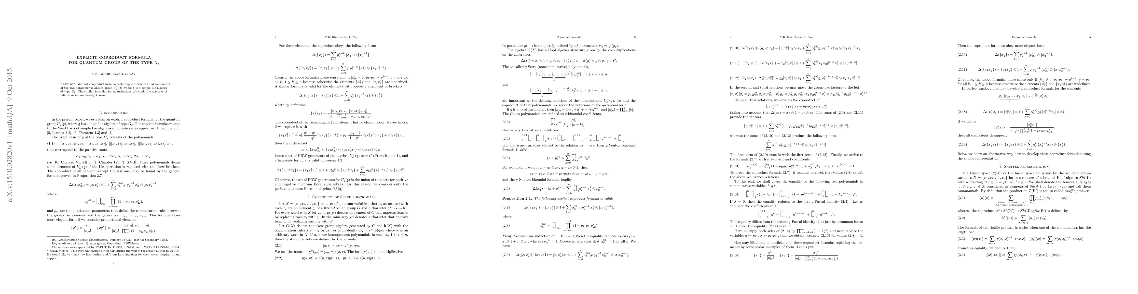 We find a coproduct formula in the explicit form for PBW-generators of the two-parameter quantum group $U_q^+(\frak{g})$ where $\frak{g}$ is a simple Lie algebra of type $G_2$. The similar formulas for quantizations of simple Lie algebras of infinite series are already known.