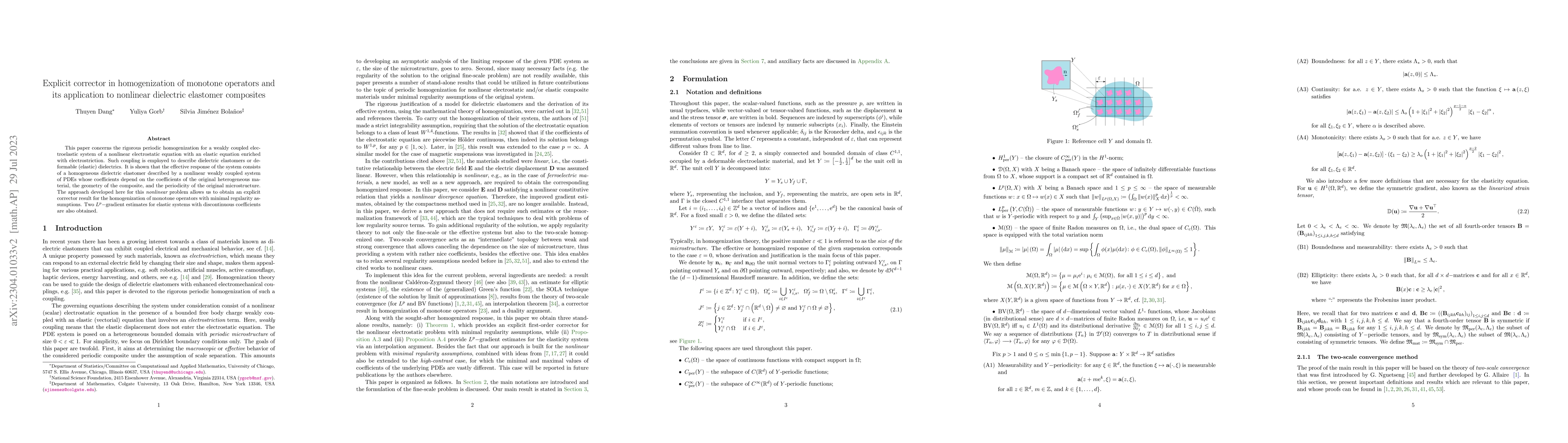 This paper develops a rigorous periodic homogenization method for an electroelastic system describing nonlinear dielectric elastomers, obtaining an explicit corrector and $L^p$-gradient estimates for monotone operators with minimal assumptions. The effective response is modeled by a weakly coupled system of PDEs dependent on material coefficients and composite geometry.