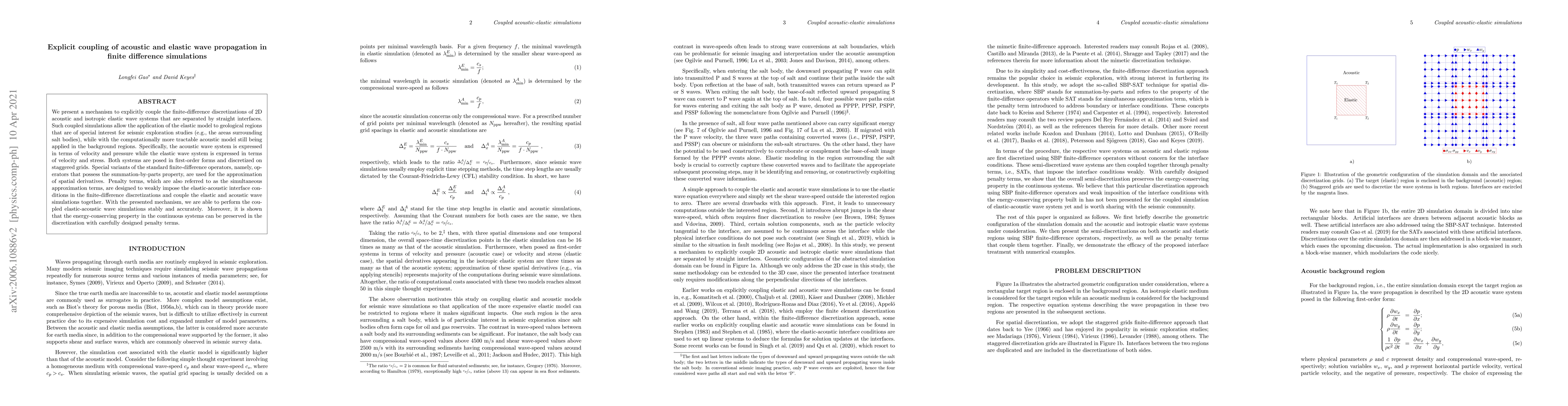 This paper presents a method to explicitly couple finite-difference simulations of 2D acoustic and elastic wave propagation, allowing the use of a computationally efficient acoustic model in background regions and an elastic model in geologically significant areas. The coupling is achieved through specially designed penalty terms that enforce interface conditions.