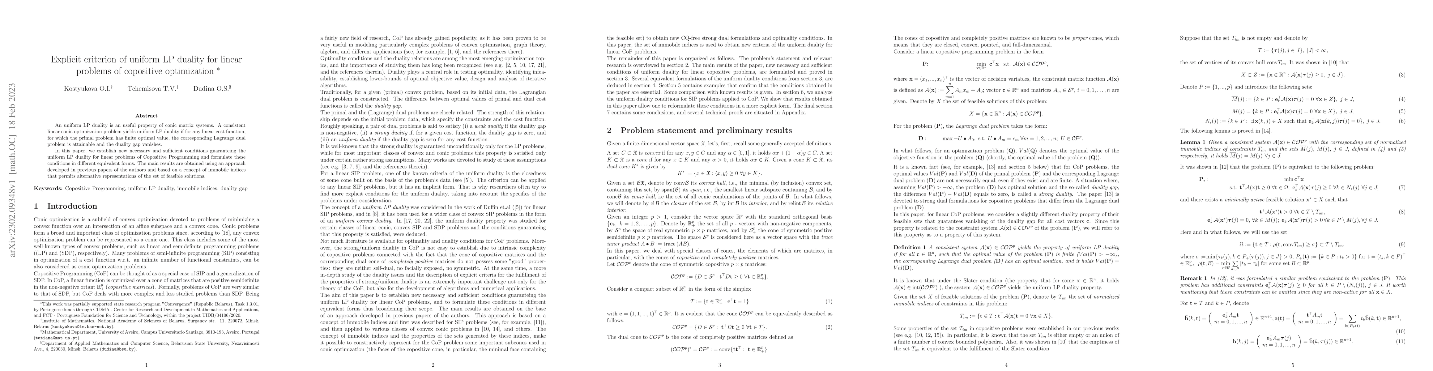 This paper establishes new necessary and sufficient conditions for uniform LP duality in linear problems of copositive optimization. It formulates these conditions in various equivalent forms, leveraging a concept of immobile indices to provide alternative representations of feasible solutions.