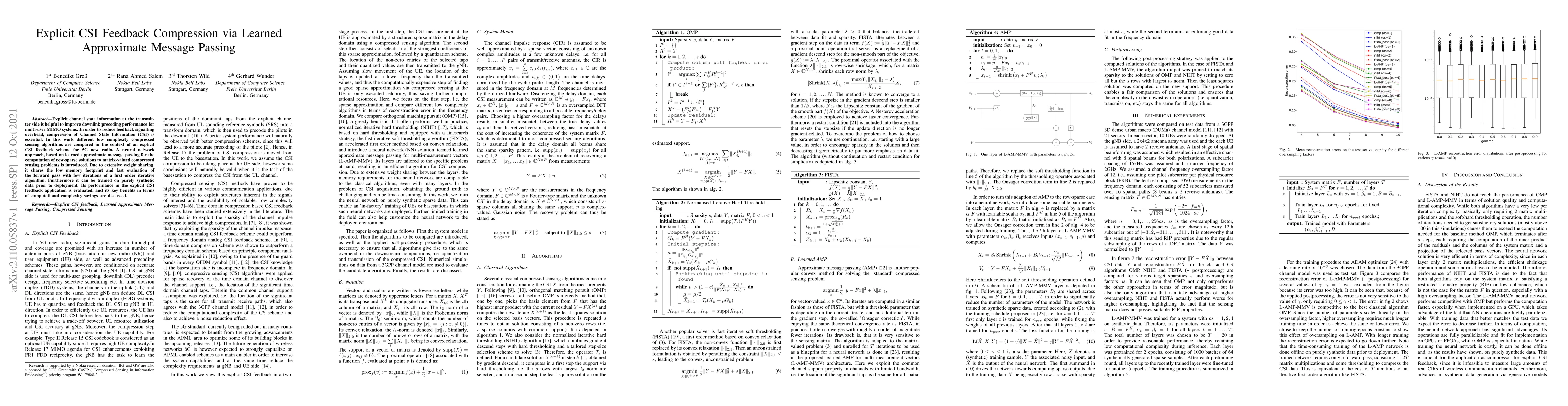 Explicit channel state information at the transmitter side is helpful to improve downlink precoding performance for multi-user MIMO systems. In order to reduce feedback signalling overhead, compression of Channel State Information (CSI) is essential. In this work different low complexity compressed sensing algorithms are compared in the context of an explicit CSI feedback scheme for 5G new radio. A neural network approach, based on learned approximate message passing for the computation of row-sparse solutions to matrix-valued compressed sensing problems is introduced. Due to extensive weight sharing, it shares the low memory footprint and fast evaluation of the forward pass with few iterations of a first order iterative algorithm. Furthermore it can be trained on purely synthetic data prior to deployment. Its performance in the explicit CSI feedback application is evaluated, and its key benefits in terms of computational complexity savings are discussed.