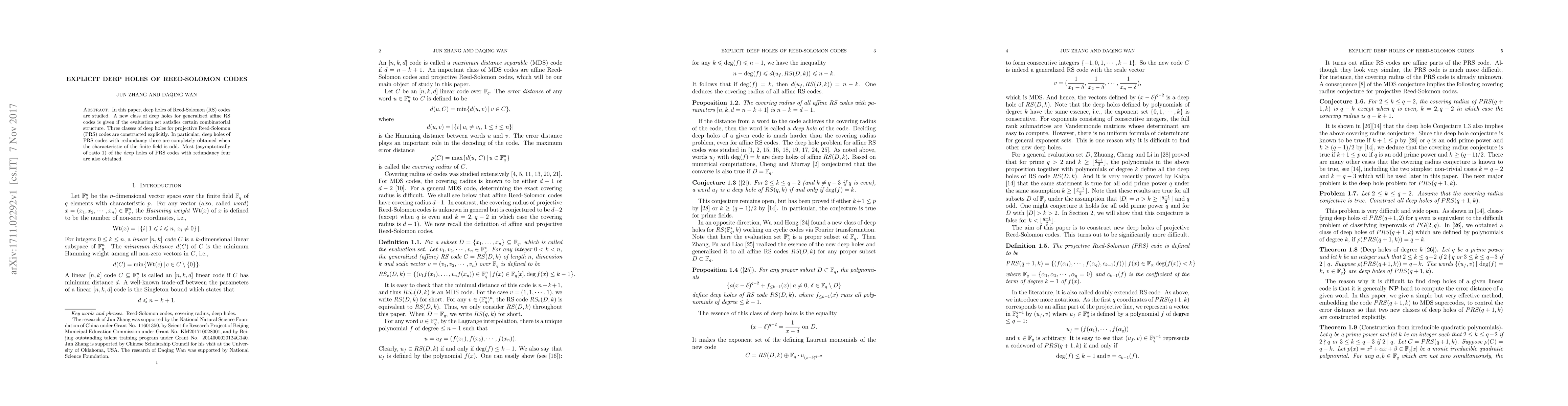 In this paper, deep holes of Reed-Solomon (RS) codes are studied. A new class of deep holes for generalized affine RS codes is given if the evaluation set satisfies certain combinatorial structure. Three classes of deep holes for projective Reed-Solomon (PRS) codes are constructed explicitly. In particular, deep holes of PRS codes with redundancy three are completely obtained when the characteristic of the finite field is odd. Most (asymptotically of ratio $1$) of the deep holes of PRS codes with redundancy four are also obtained.