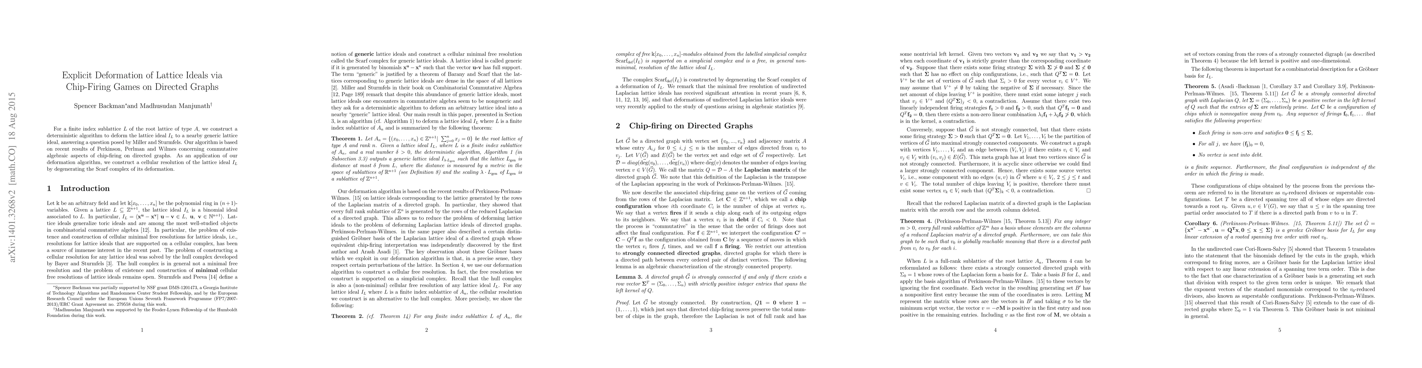 For a finite index sublattice $L$ of the root lattice $A_{n}$, we construct a deterministic algorithm to deform the lattice ideal $I_L$ to a nearby generic lattice ideal, answering a question posed by Miller and Sturmfels. Our algorithm is based on recent results of Perkinson, Perlman and Wilmes concerning commutative algebraic aspects of chip firing on directed graphs. As an application of our deformation algorithm, we construct a cellular resolution of the lattice ideal $I_L$ by degenerating the Scarf complex of its deformation.