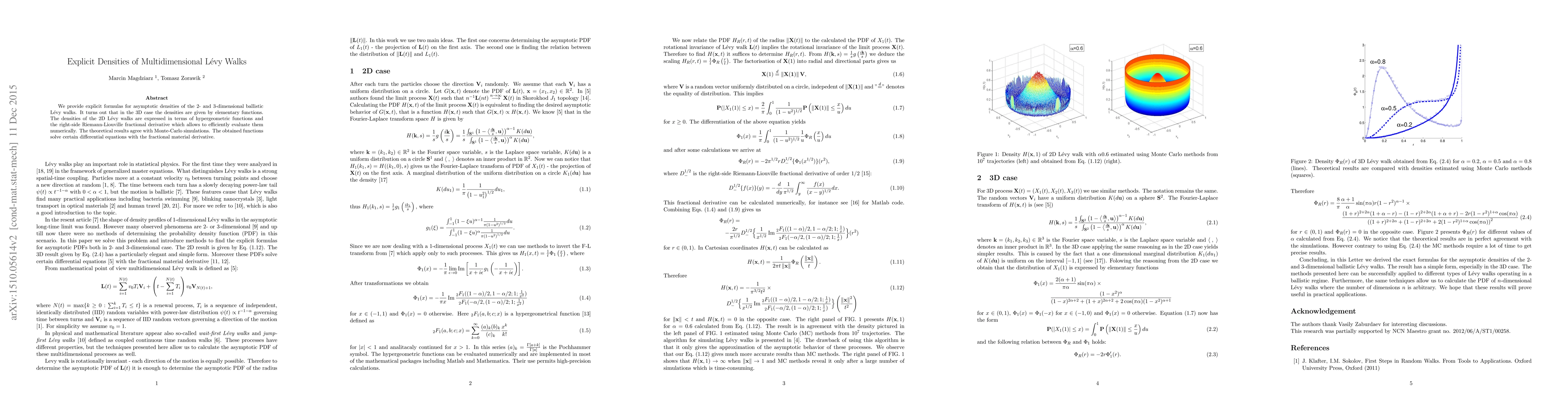 This paper presents explicit formulas for the asymptotic densities of 2- and 3-dimensional L\'evy walks, with 3D densities expressed by elementary functions and 2D densities using hypergeometric functions and fractional derivatives, validated by Monte-Carlo simulations. The derived functions satisfy differential equations with fractional material derivatives.