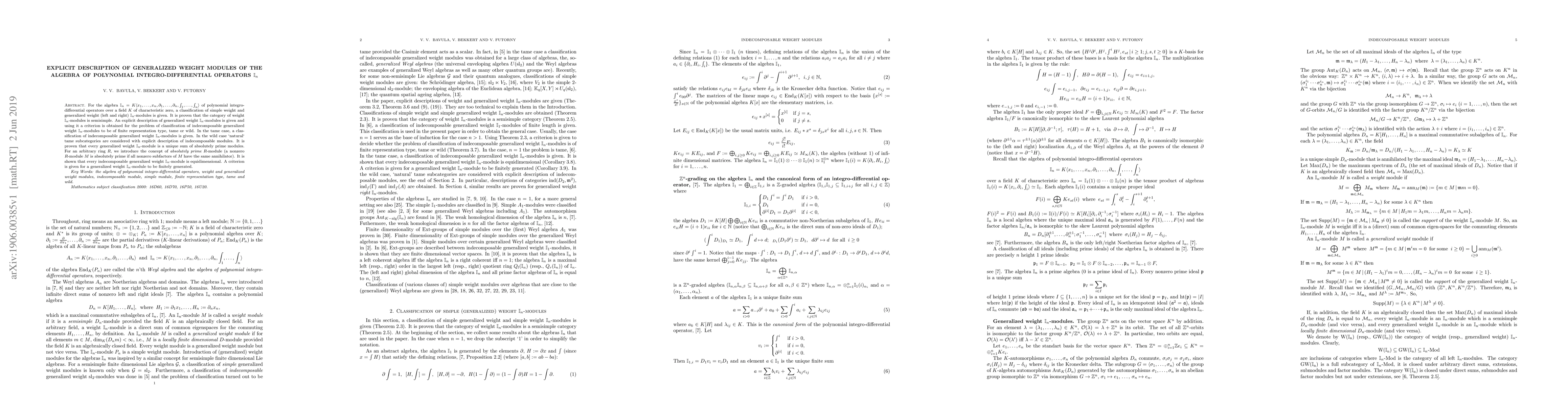 For the algebra $I_n$ of polynomial integro-differential operators over a field $K$ of characteristic zero, a classification of simple weight and generalized weight (left and right) $I_n$-modules is given. It is proven that the category of weight $I_n$-modules is semisimple. An explicit description of generalized weight $I_n$-modules is given and using it a criterion is obtained for the problem of classification of indecomposable generalized weight $I_n$-modules to be of finite representation type, tame or wild. In the tame case, a classification of indecomposable generalized weight $I_n$-modules is given. In the wild case `natural` tame subcategories are considered with explicit description of indecomposable modules. It is proven that every generalized weight $I_n$-module is a unique sum of absolutely prime modules. For an arbitrary ring $R$, we introduce the concept of {\em absolutely prime} $R$-module (a nonzero $R$-module $M$ is absolutely prime if all nonzero subfactors of $M$ have the same annihilator). It is shown that every indecomposable generalized weight $I_n$-module is equidimensional. A criterion is given for a generalized weight $I_n$-module to be finitely generated.