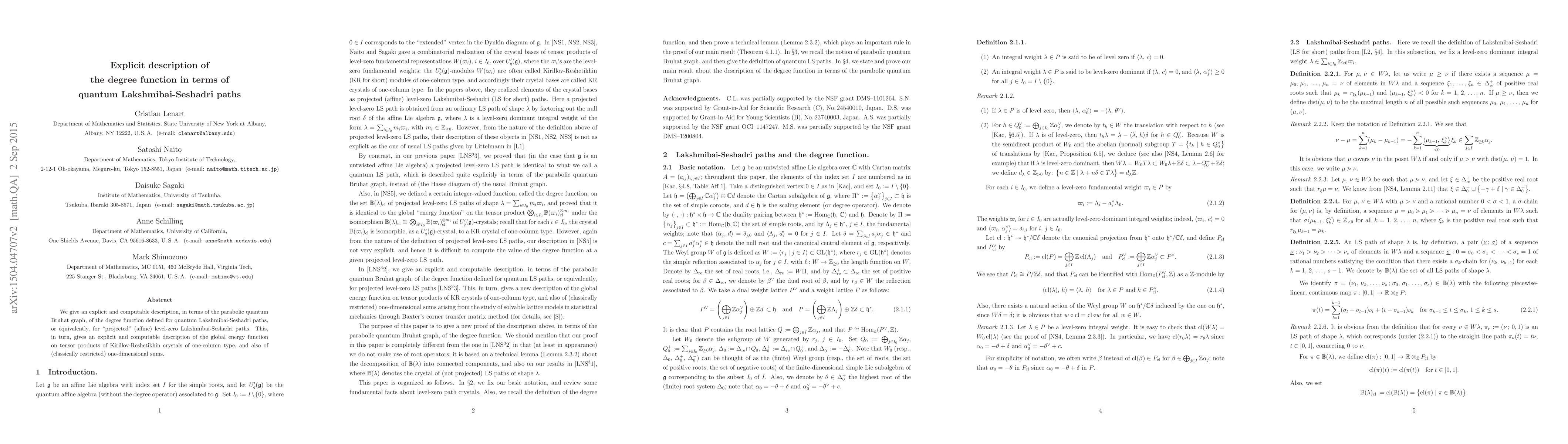 We give an explicit and computable description, in terms of the parabolic quantum Bruhat graph, of the degree function defined for quantum Lakshmibai-Seshadri paths, or equivalently, for "projected" (affine) level-zero Lakshmibai-Seshadri paths. This, in turn, gives an explicit and computable description of the global energy function on tensor products of Kirillov-Reshetikhin crystals of one-column type, and also of (classically restricted) one-dimensional sums.