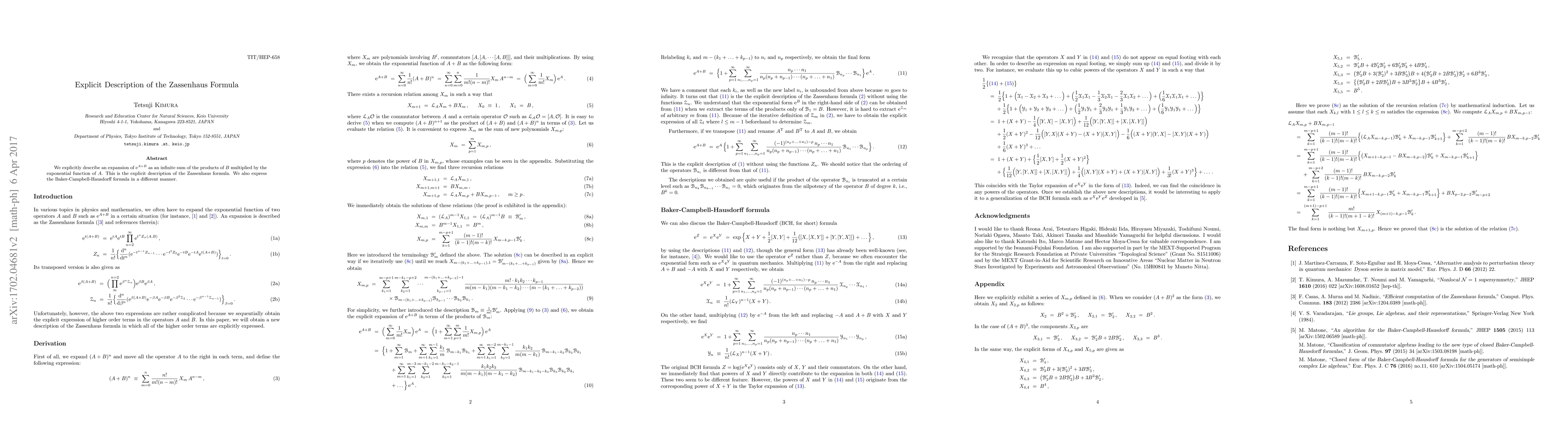 This paper provides an explicit expansion of $e^{A+B}$ as an infinite sum involving $B$ and $e^A$, detailing the Zassenhaus formula. It also reinterprets the Baker-Campbell-Hausdorff formula in a new form.