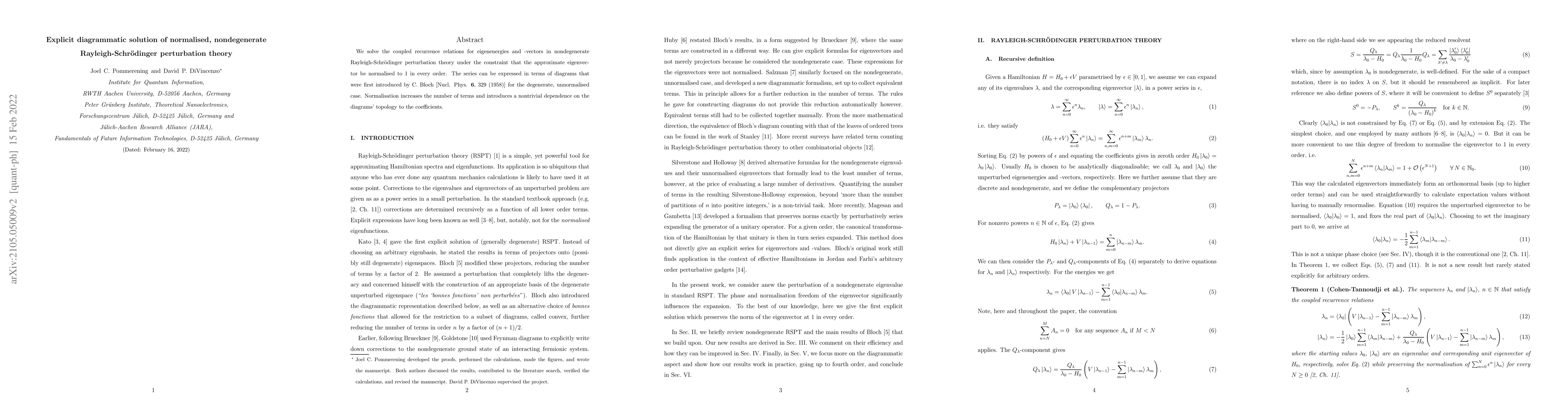 This paper presents an explicit diagrammatic solution for the normalised, nondegenerate Rayleigh-Schrödinger perturbation theory, solving the coupled recurrence relations for eigenenergies and vectors while ensuring normalisation to 1 at every order. The solution employs Bloch's diagrams, adapted to account for the increased complexity due to normalisation.