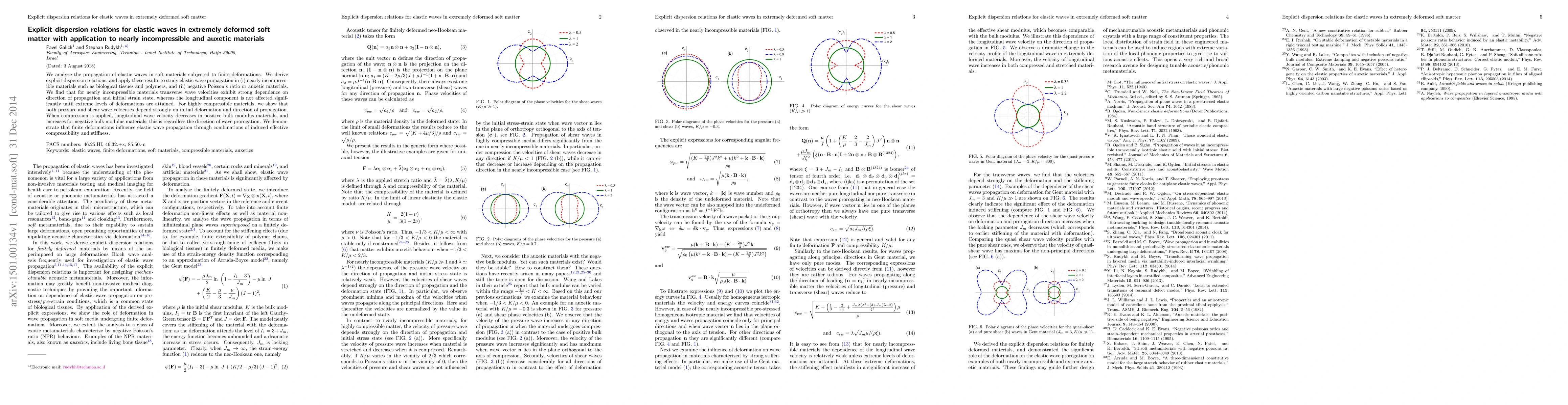 This paper derives explicit dispersion relations for elastic waves in deformed soft materials, applying them to nearly incompressible and auxetic materials. It finds that wave velocities in nearly incompressible materials are direction-dependent and strain-sensitive, while auxetic materials show strong dependence on initial deformation and wave propagation direction.