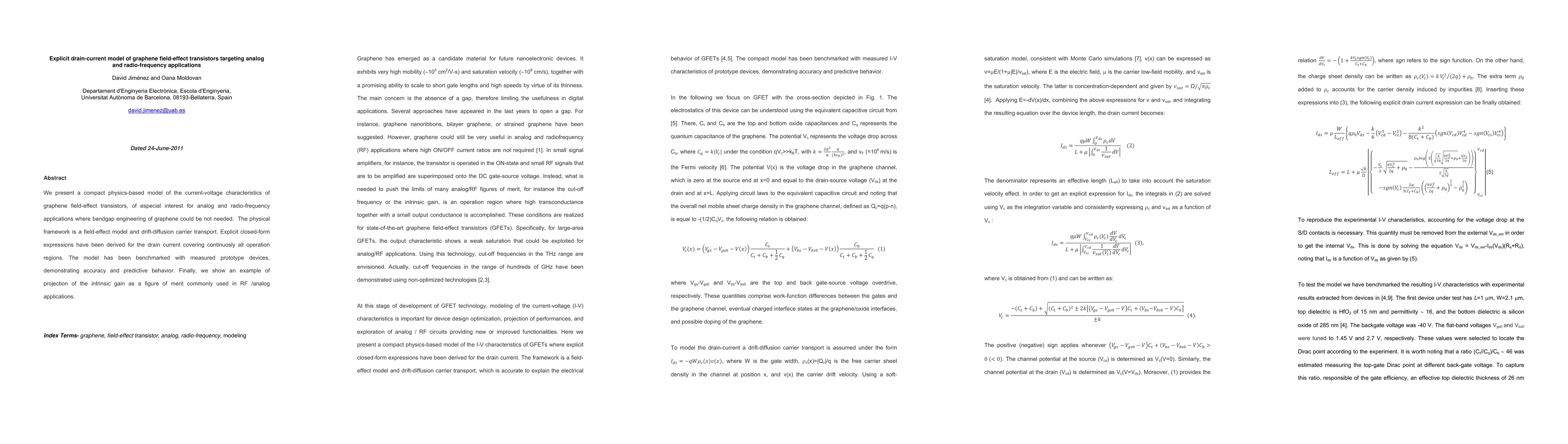 This paper proposes a physics-based drain-current model for graphene field-effect transistors, providing closed-form expressions for all operation regions and validated against prototype devices. The model is particularly suited for analog and radio-frequency applications without requiring bandgap engineering.