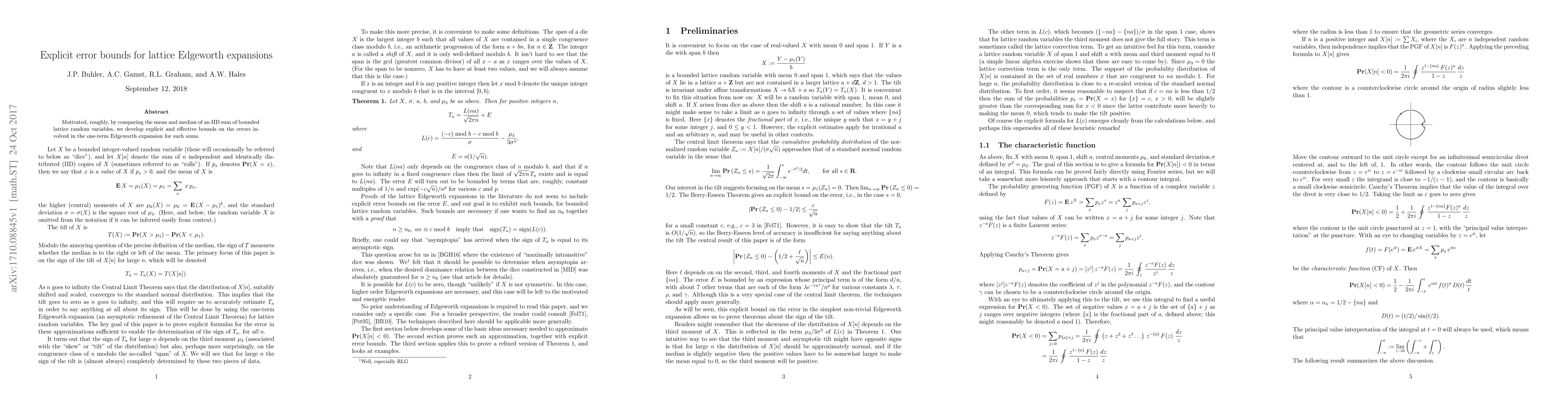 Summary: This paper provides explicit error bounds for the one-term Edgeworth expansion applied to sums of independent, identically distributed bounded lattice random variables, facilitating a precise comparison between mean and median.
