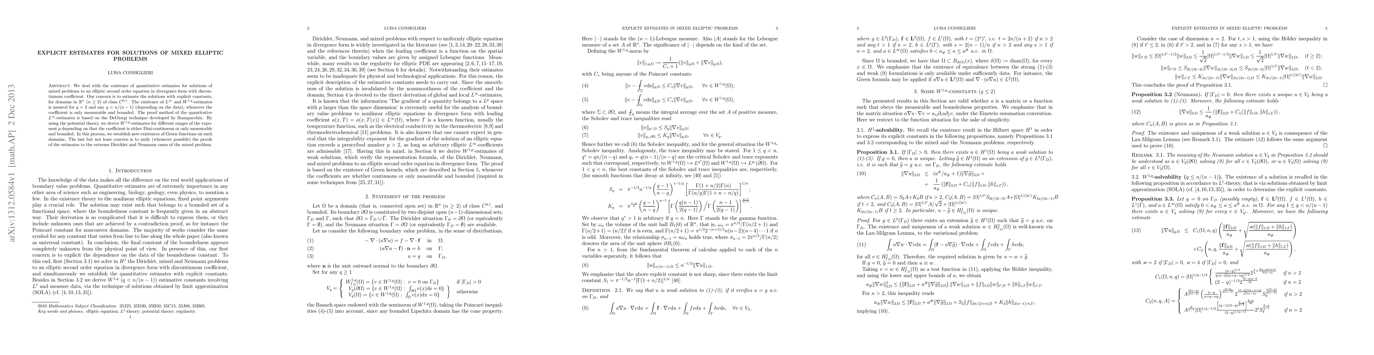 This paper provides explicit estimates for solutions of mixed elliptic problems with discontinuous coefficients on certain domains, using techniques from potential theory and the DeGiorgi method.