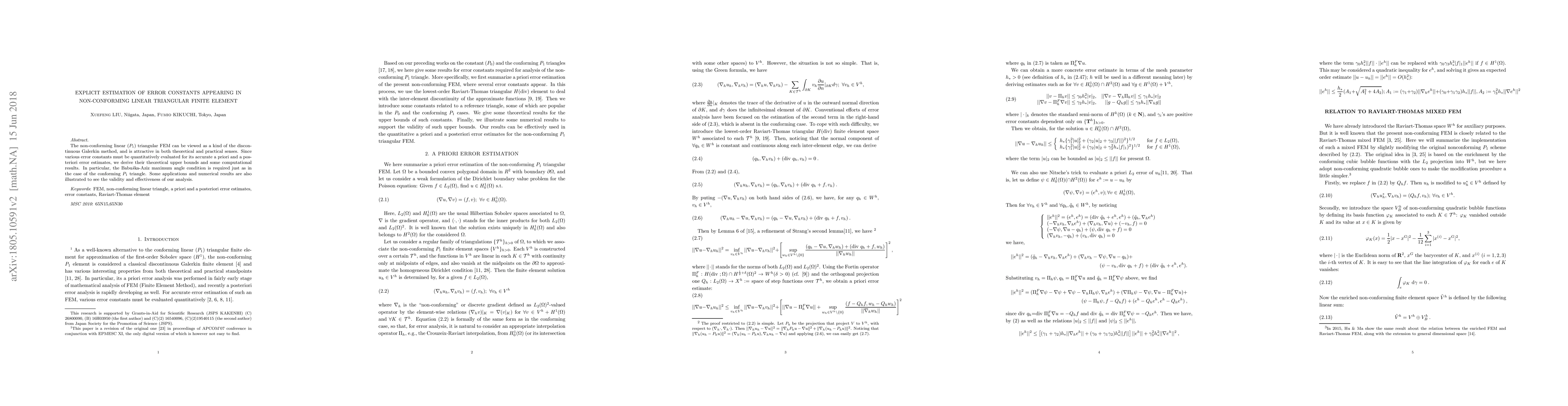 The non-conforming linear ($P_1$) triangular FEM can be viewed as a kind of the discontinuous Galerkin method, and is attractive in both theoretical and practical senses. Since various error constants must be quantitatively evaluated for its accurate a priori and a posteriori error estimates, we derive their theoretical upper bounds and some computational results. In particular, the Babu$\check{s}$ka-Aziz maximum angle condition is required just as in the case of the conforming $P_1$ triangle. Some applications and numerical results are also illustrated to see the validity and effectiveness of our analysis.
