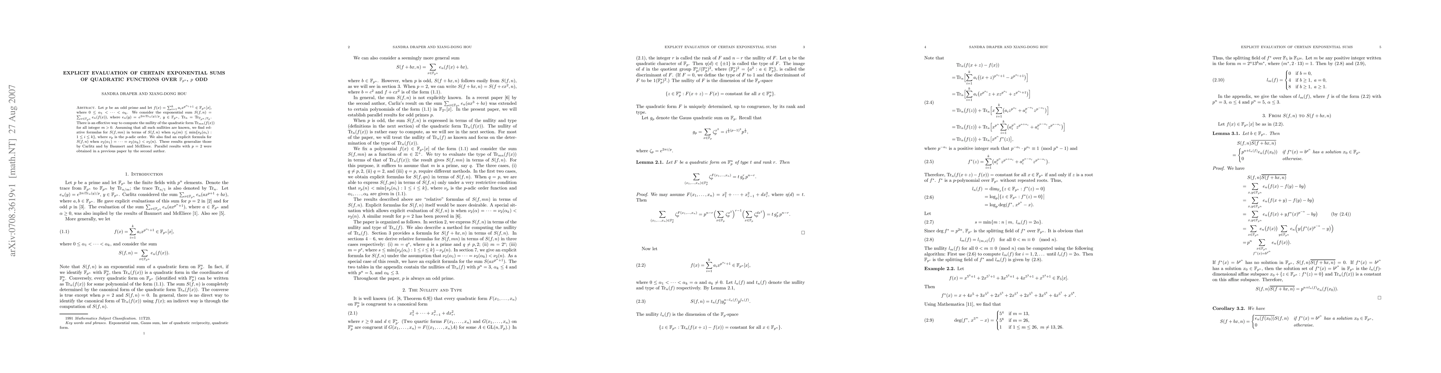 This research paper presents methods to compute exponential sums of quadratic functions over finite fields $Bbb F_{p^n}$, where $p$ is an odd prime. It introduces effective techniques to determine the nullity of quadratic forms and provides relative formulas for exponential sums $S(f,mn)$ in terms of $S(f,n)$. The paper also offers an explicit formula for $S(f,n)$ under certain conditions, generalizing previous works by Carlitz and Baumert & McEliece. Parallel results for $p=2$ were previously established by the second author.