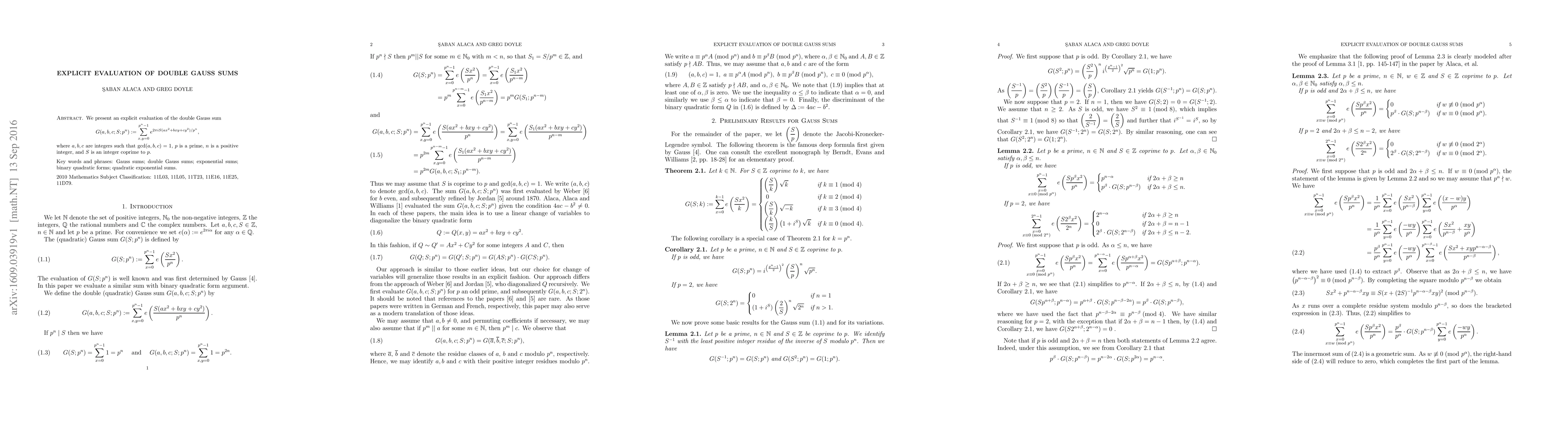 We present an explicit evaluation of the double Gauss sum $\displaystyle G(a,b,c;S;p^n):=\sum_{x,y=0}^{p^n-1} e^{2\pi i S(ax^2+bxy+cy^2)/p^n}$, where $a, b, c$ are integers such that $\gcd(a,b,c)=1$, $p$ is a prime, $n$ is a positive integer, and $S$ is an integer coprime to $p$.