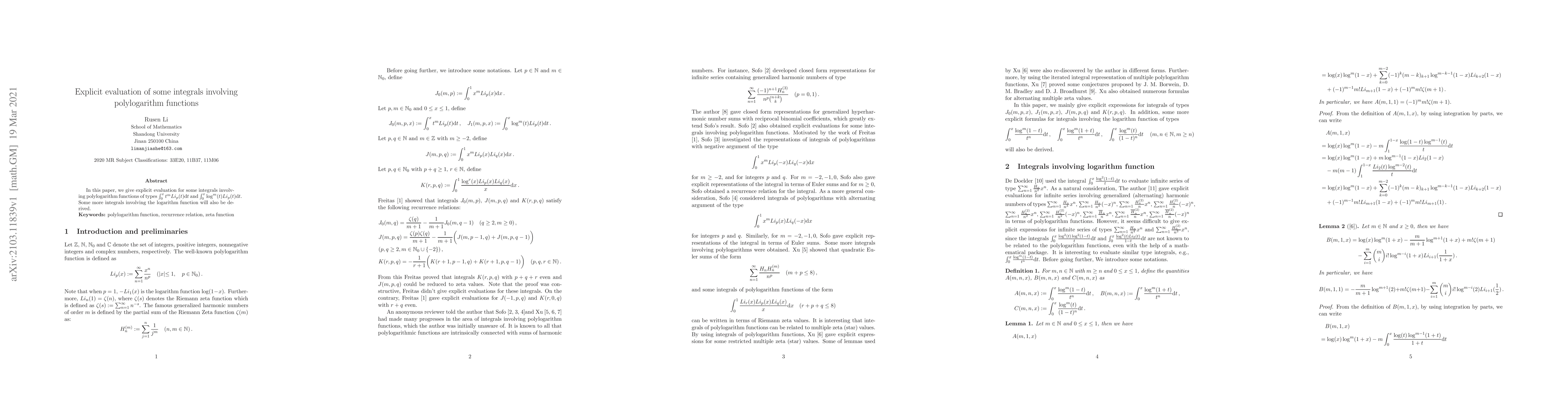 This paper provides explicit evaluations for integrals involving polylogarithm functions, specifically $\int_{0}^{x}t^{m} Li_{p}(t)\mathrm{d}t$ and $\int_{0}^{x}\log^{m}(t) Li_{p}(t)\mathrm{d}t$, along with additional integrals involving the logarithm function.