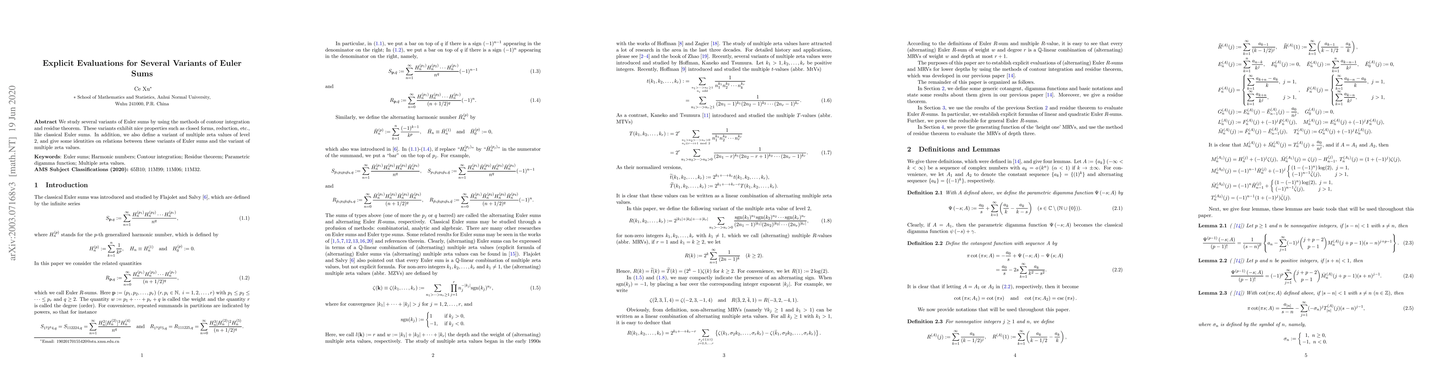 This paper explores various Euler sum variants using contour integration and residue theorem, discovering closed forms and reduction properties similar to classical Euler sums. It also introduces a level 2 variant of multiple zeta values and establishes relationships between these new Euler sum variants and the multiple zeta values.