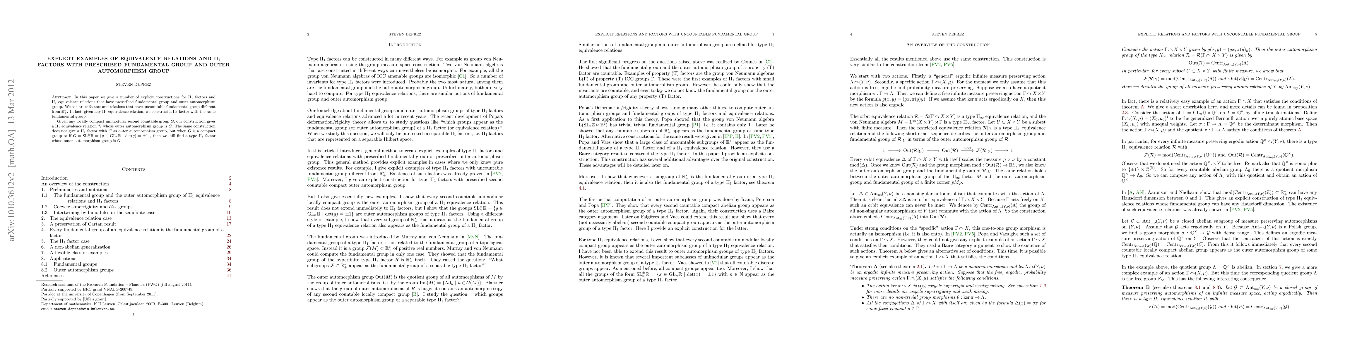 This paper provides explicit constructions of II$_1$ factors and equivalence relations with specified fundamental groups and outer automorphism groups, including cases with uncountable fundamental groups. It also constructs II$_1$ equivalence relations with outer automorphism groups corresponding to given locally compact groups.