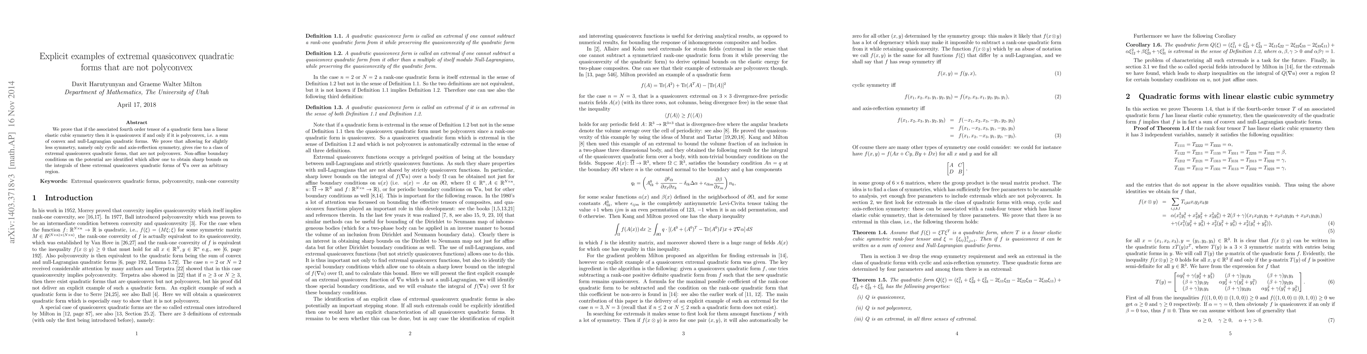 We prove that if the associated fourth order tensor of a quadratic form has a linear elastic cubic symmetry then it is quasiconvex if and only if it is polyconvex, i.e. a sum of convex and null-Lagrangian quadratic forms. We prove that allowing for slightly less symmetry, namely only cyclic and axis-reflection symmetry, gives rise to a class of extremal quasiconvex quadratic forms, that are not polyconvex. Non-affine boundary conditions on the potential are identified which allow one to obtain sharp bounds on the integrals of these extremal quasiconvex quadratic forms of $\nabla u$ over an arbitrary region.