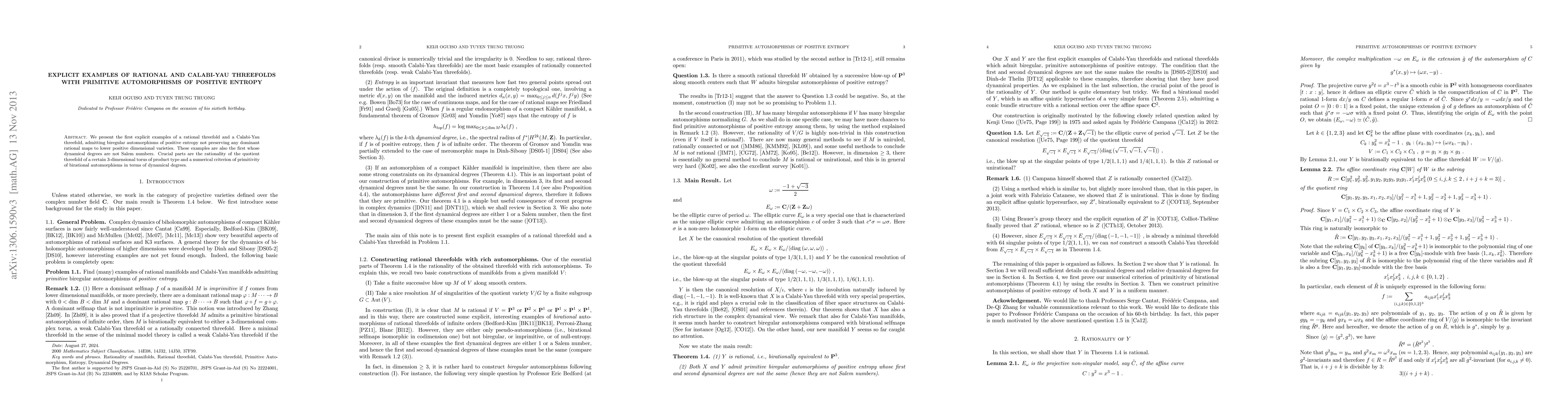 This research provides the first concrete examples of rational and Calabi-Yau threefolds, exhibiting biregular automorphisms with positive entropy that don't maintain any dominant rational maps to smaller varieties. The key lies in demonstrating the rationality of the quotient threefold derived from a 3-dimensional torus of product type.