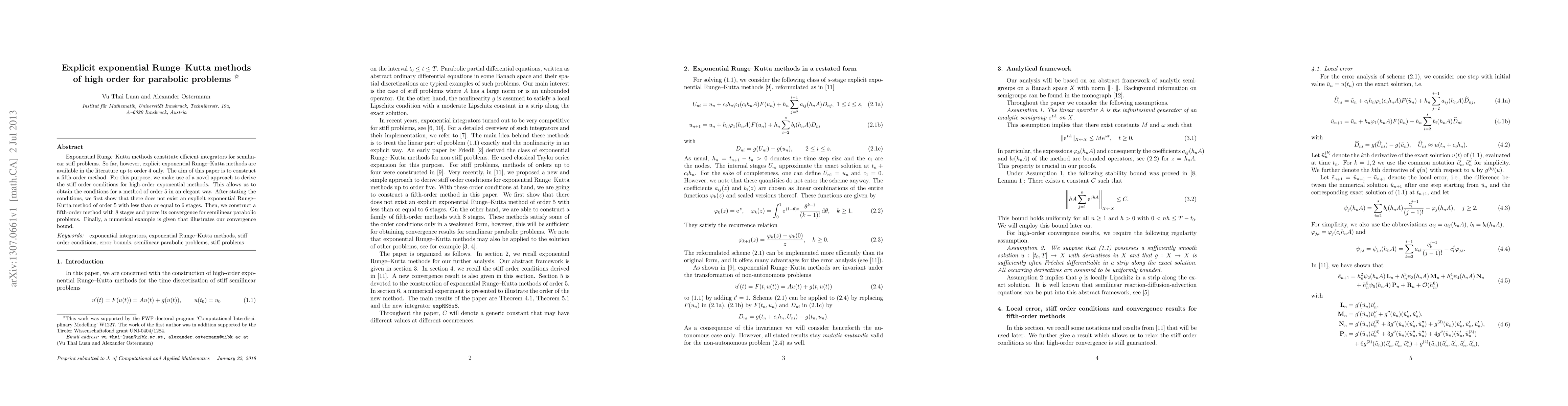 This paper constructs an explicit exponential Runge-Kutta method of fifth order for solving semilinear stiff parabolic problems, utilizing a novel approach to derive stiff order conditions. It proves that an 8-stage method is required for order 5 and provides a numerical example to illustrate its convergence.
