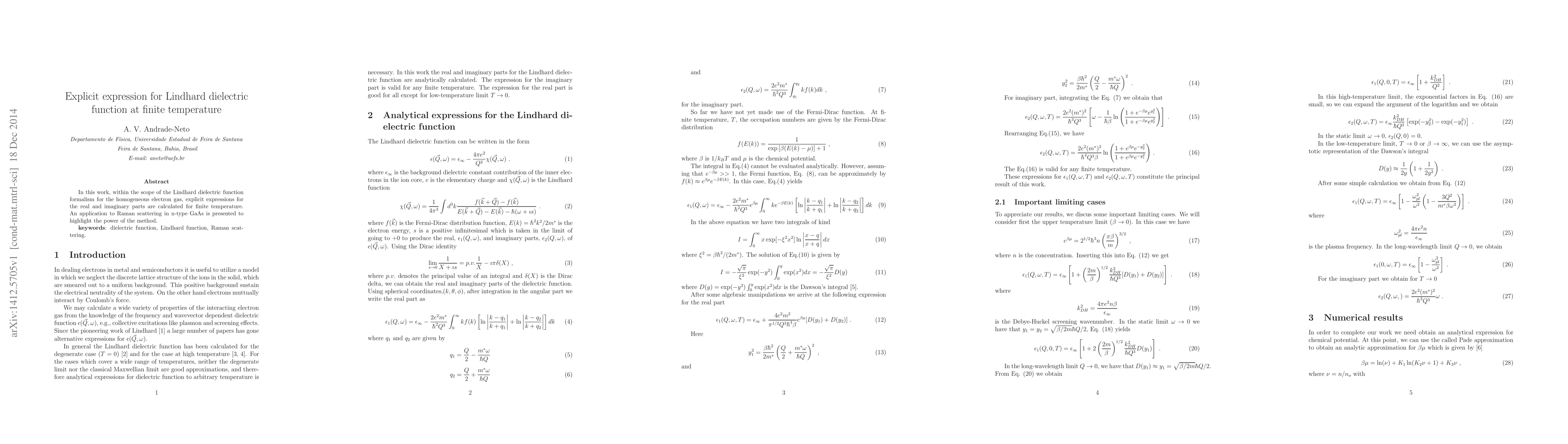 Researchers developed explicit expressions for the real and imaginary parts of the Lindhard dielectric function at finite temperature, with applications in Raman scattering studies, such as n-type GaAs.