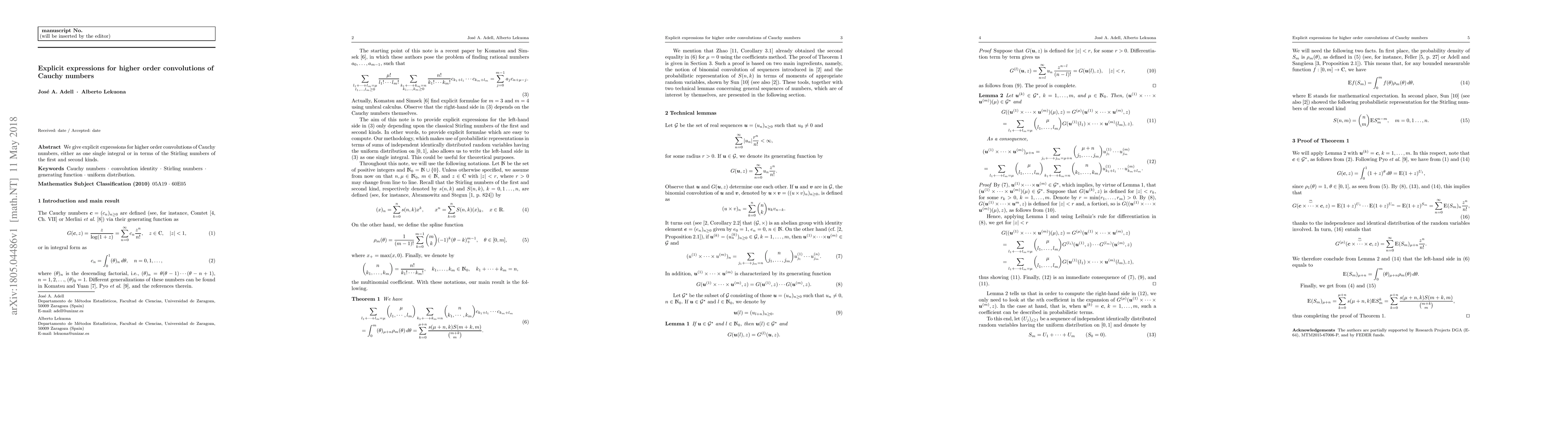 We give explicit expressions for higher order convolutions of Cauchy numbers, either as one single integral or in terms of the Stirling numbers of the first and second kinds.