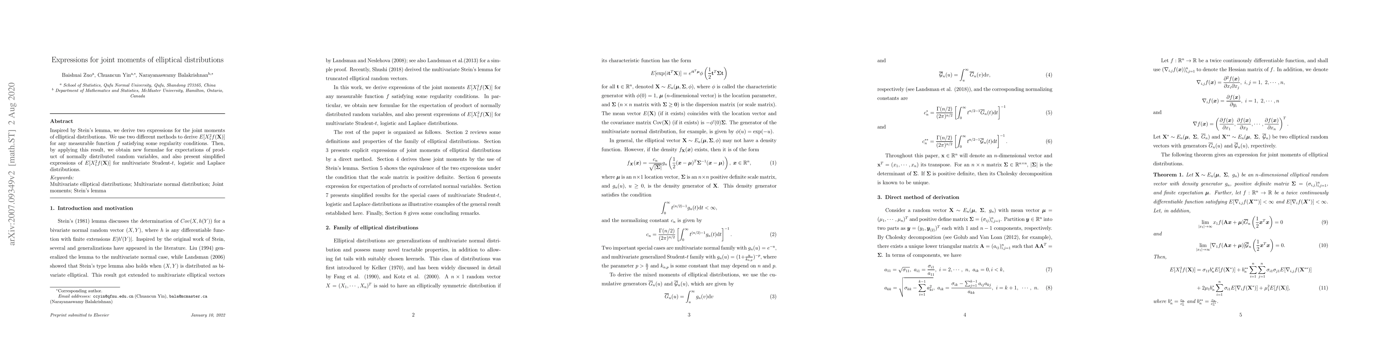 Researchers derive two expressions for the joint moments of elliptical distributions, expanding on Stein's lemma to simplify expectations for various distributions including normal, Student-t, logistic, and Laplace.