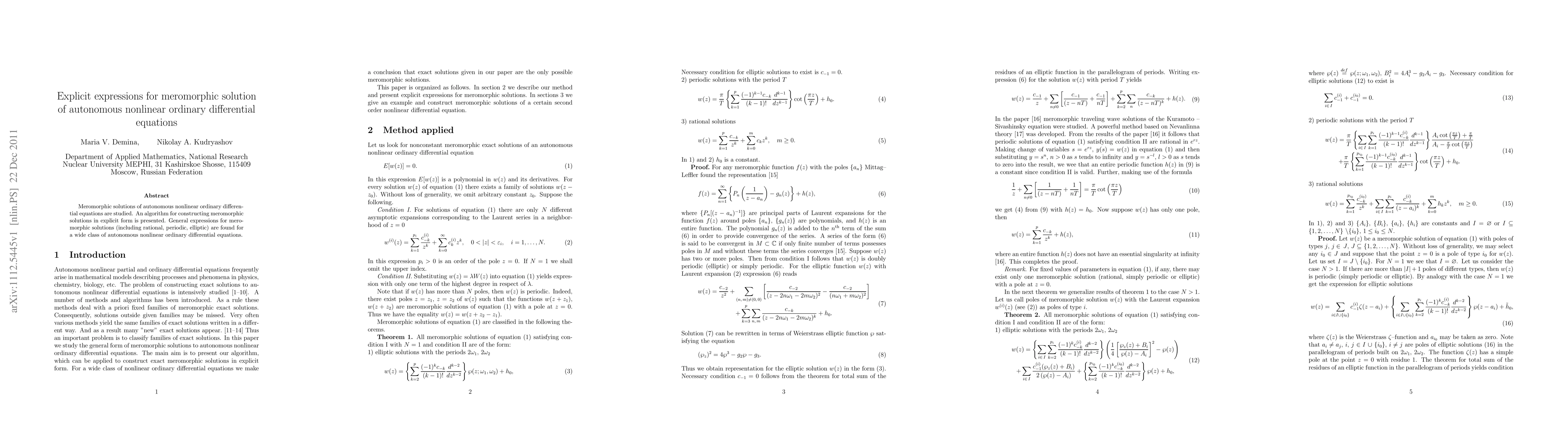 Summary: This paper presents an algorithm to construct explicit meromorphic solutions for autonomous nonlinear ordinary differential equations, providing general expressions for various types of meromorphic solutions such as rational, periodic, and elliptic functions.