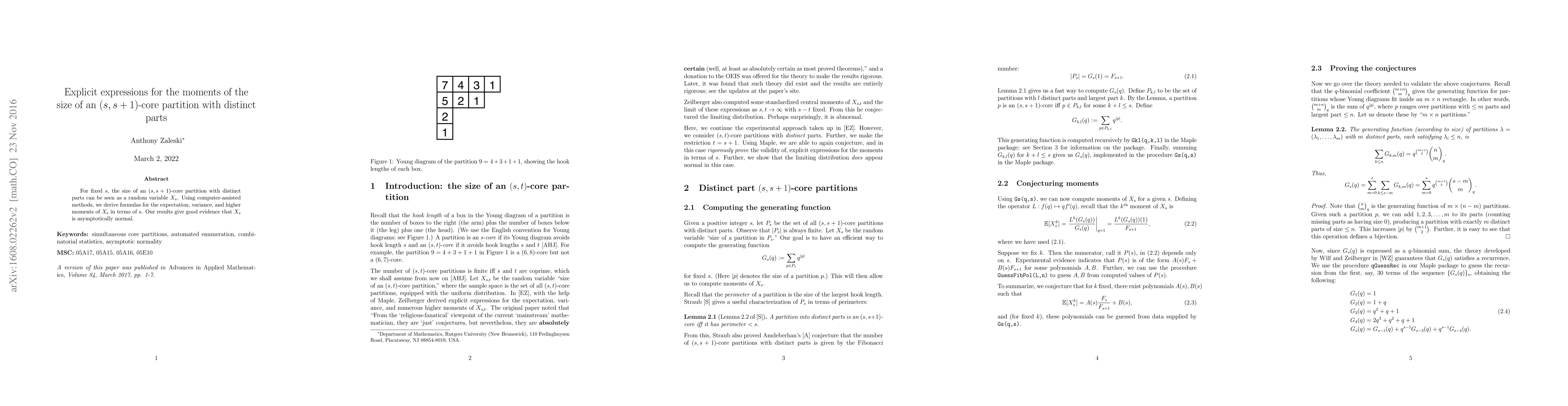 For fixed s, the size of an (s, s+1)-core partition with distinct parts can be seen as a random variable X_s. Using computer-assisted methods, we derive formulas for the expectation, variance, and higher moments of X_s. Our results give good evidence that X_s is asymptotically normal.