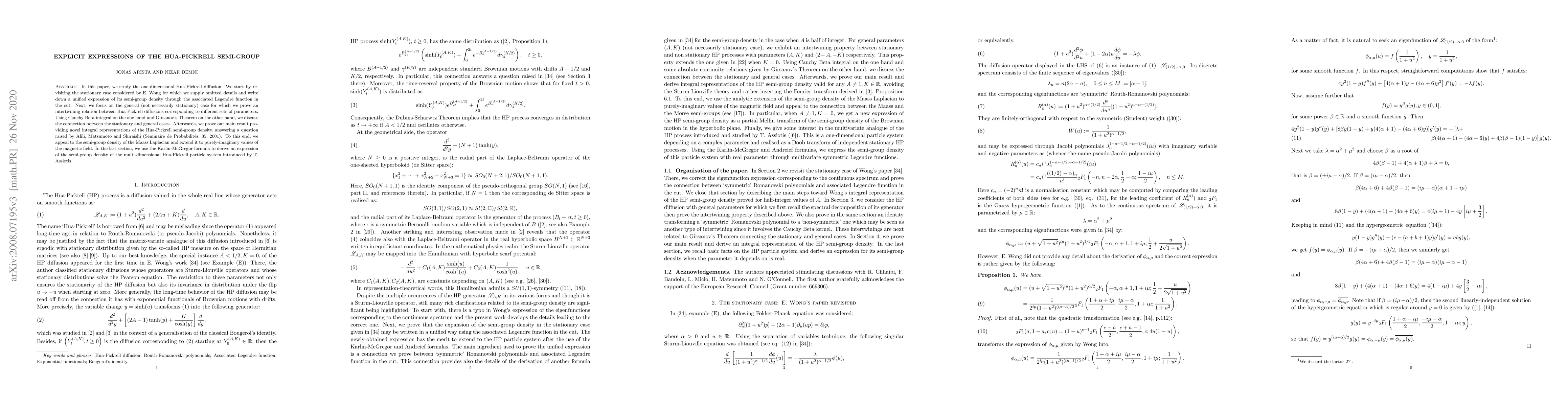 In this paper, we study the one-dimensional Hua-Pickrell diffusion. We start by revisiting the stationary case considered by E. Wong for which we supply omitted details and write down a unified expression of its semi-group density through the associated Legendre function in the cut. Next, we focus on the general (not necessarily stationary) case for which we prove an intertwining relation between Hua-Pickrell diffusions corresponding to different sets of parameters. Using Cauchy Beta integral on the one hand and Girsanov's Theorem on the other hand, we discuss the connection between the stationary and general cases. Afterwards, we prove our main result providing novel integral representations of the Hua-Pickrell semi-group density, answering a question raised by Alili, Matsumoto and Shiraishi (S\'eminaire de Probabilit\'es, 35, 2001). To this end, we appeal to the semi-group density of the Maass Laplacian and extend it to purely-imaginary values of the magnetic field. In the last section, we use the Karlin-McGregor formula to derive an expression of the semi-group density of the multi-dimensional Hua-Pickrell particle system introduced by T. Assiotis.